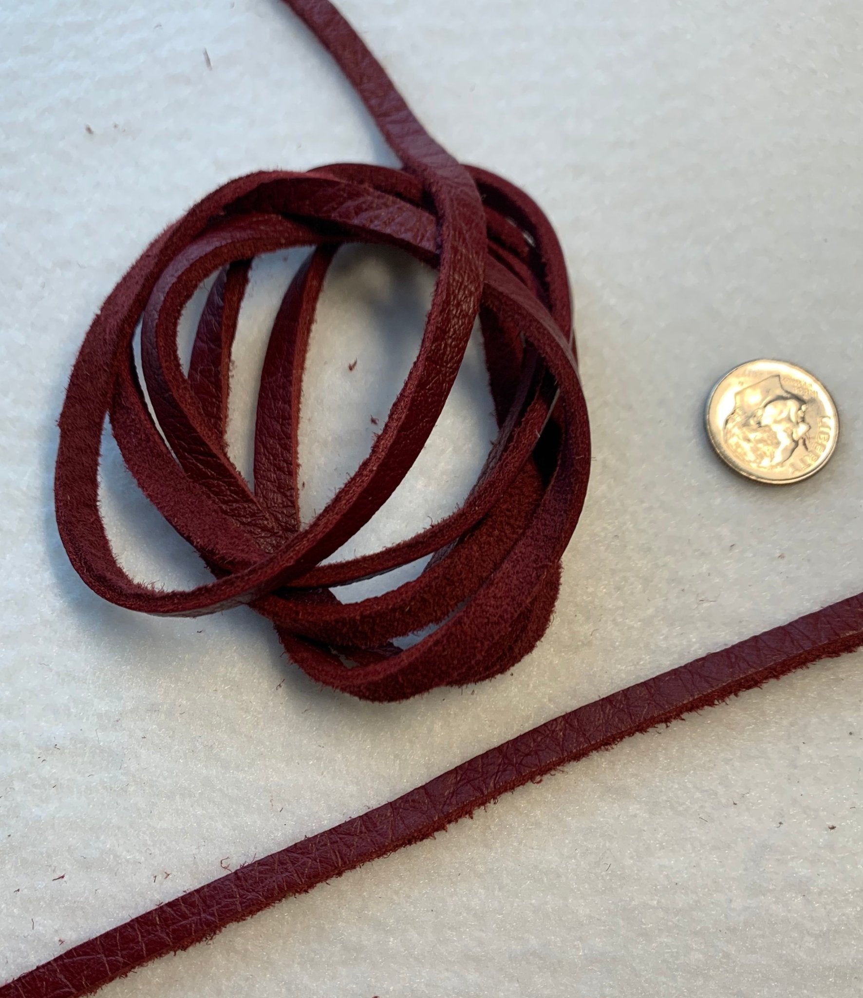 This buckskin strip is hand cut, dyed and it is approximately 42" long x 1/4" (5mm) wide x 2mm thick. Each strip has a smooth side and a rough side.