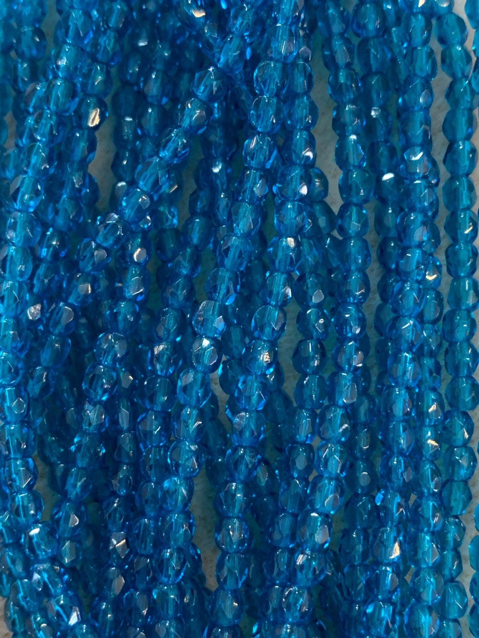 These 3mm Fire Polished beads are sold by the 6" (15cm) strand. Each strand has approximately 50 beads. The hole is approximately .5mm.