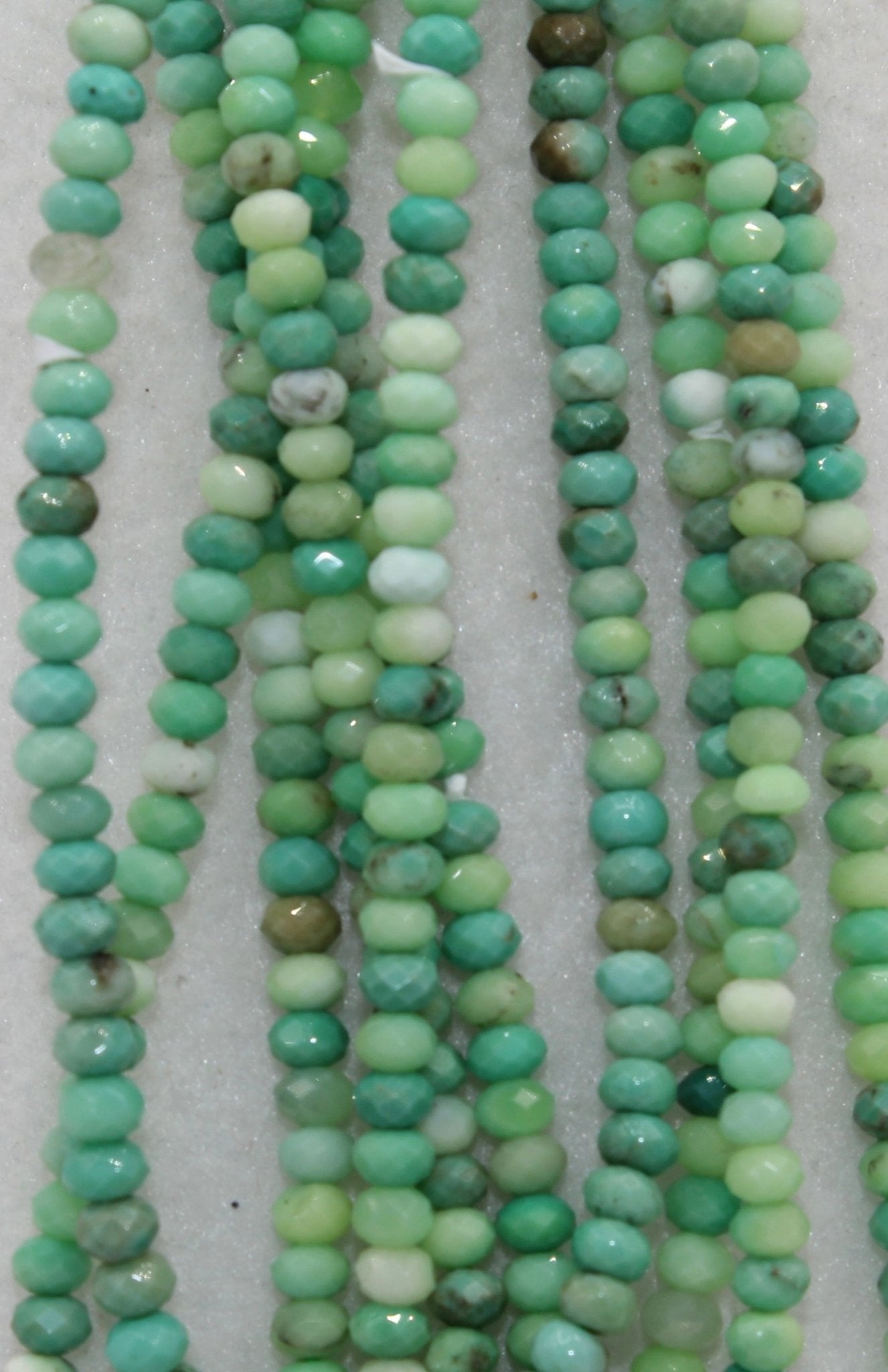 These faceted Chrysoprase rondelle beads range in color from dark to mint green, to almost white.