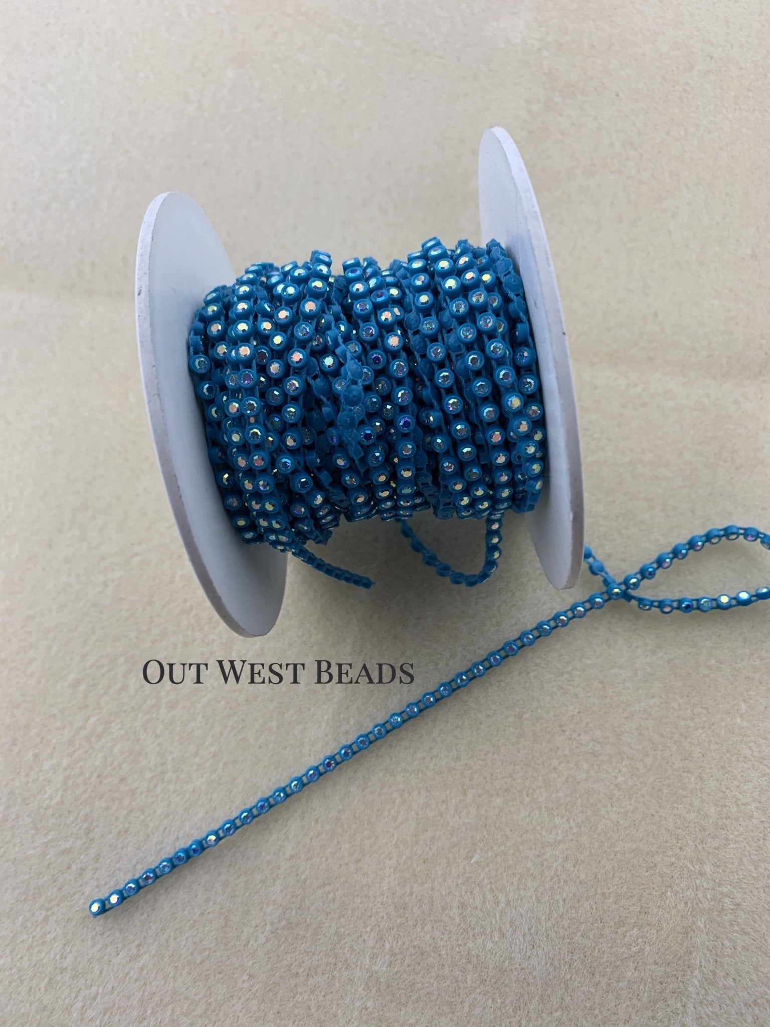 This crystal banding is size SS8 (3mm crystals). The crystals are crystal AB set in aqua banding. It comes in a 1 foot increment.