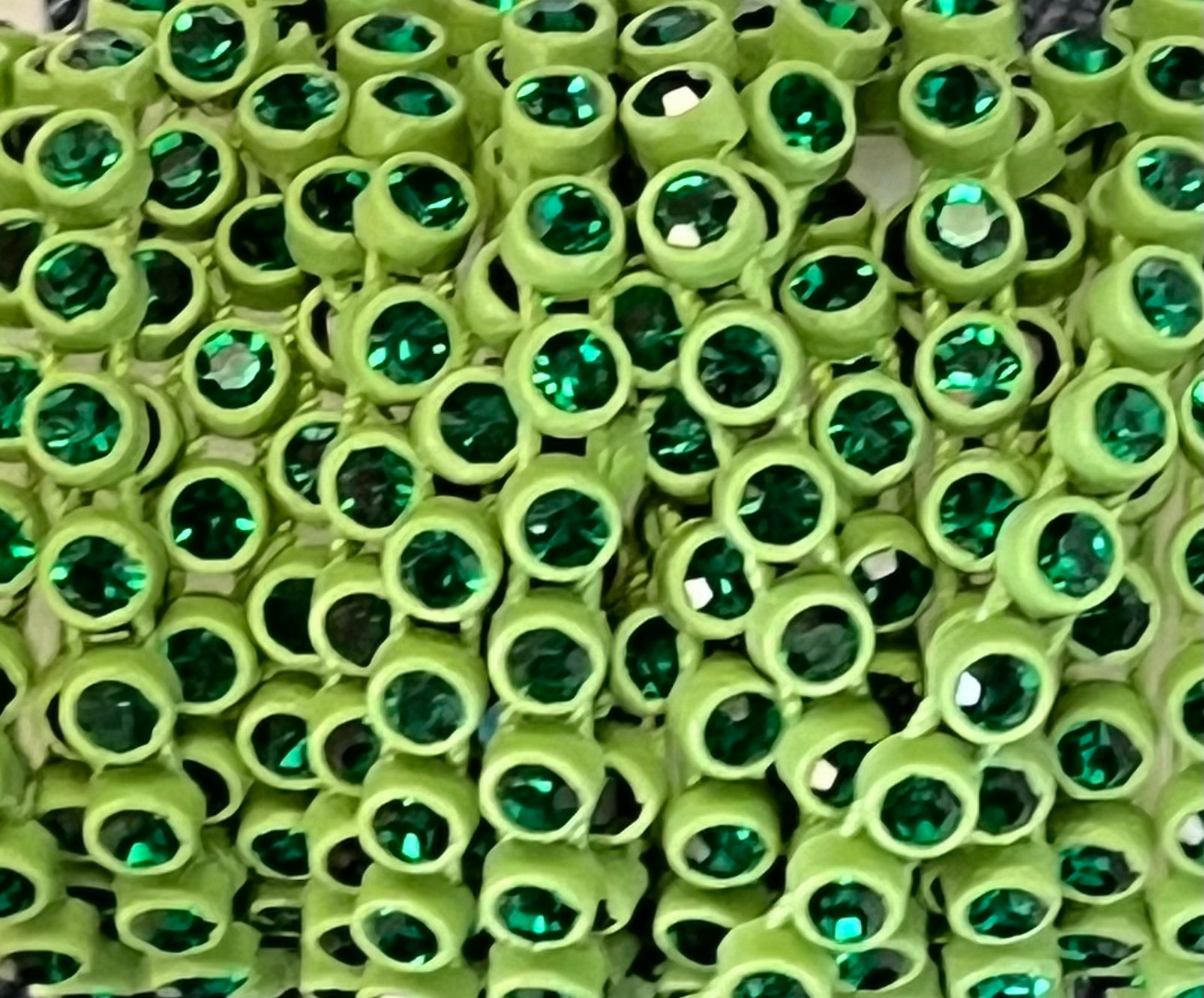 This crystal banding is size SS13 (4mm crystals). It has emerald crystals set in lime green banding. It is sold by the foot (30cm.)