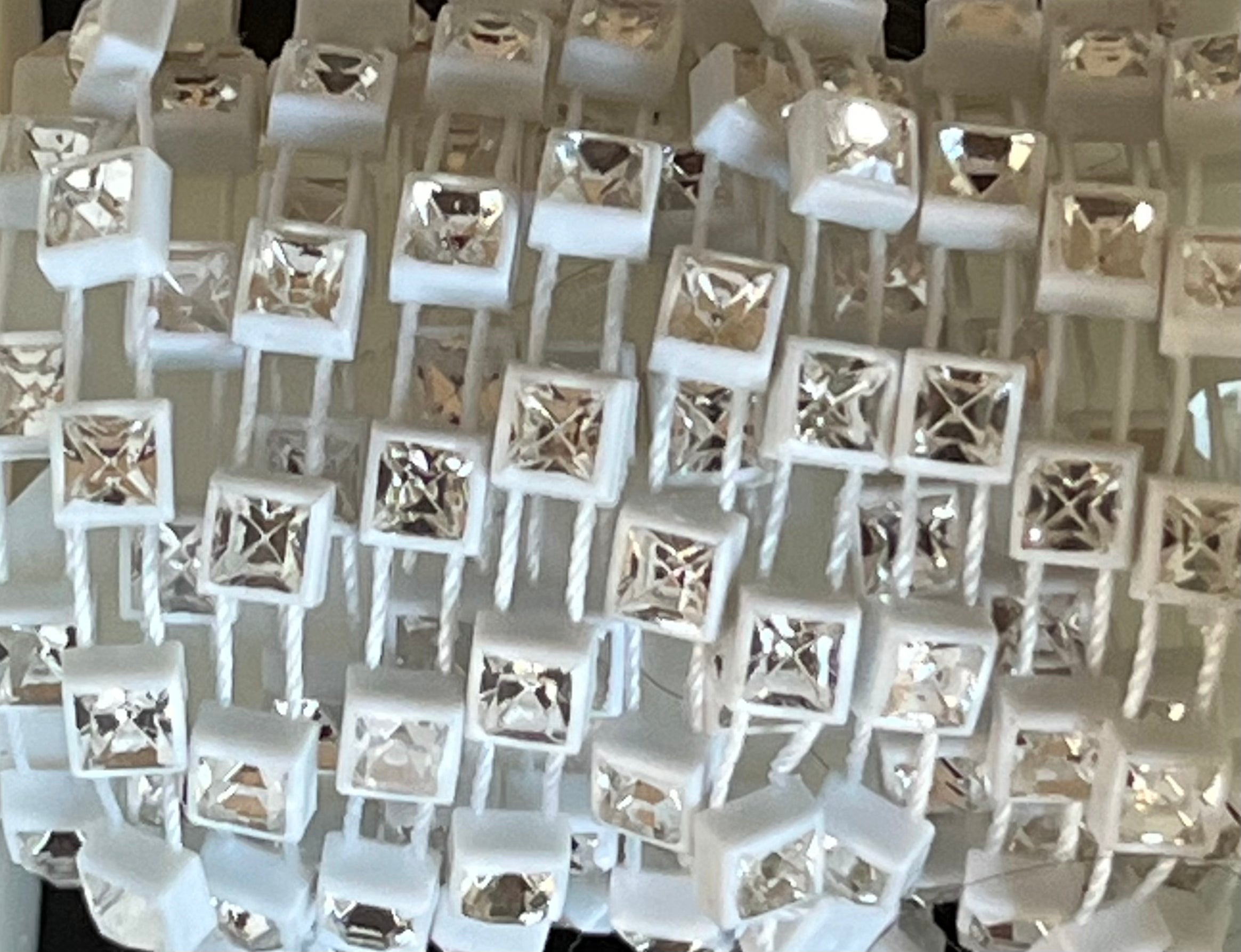 This crystal banding has clear square crystals set into white fabric banding. The crystals are 6mm, and the space between the crystals is 6mm.