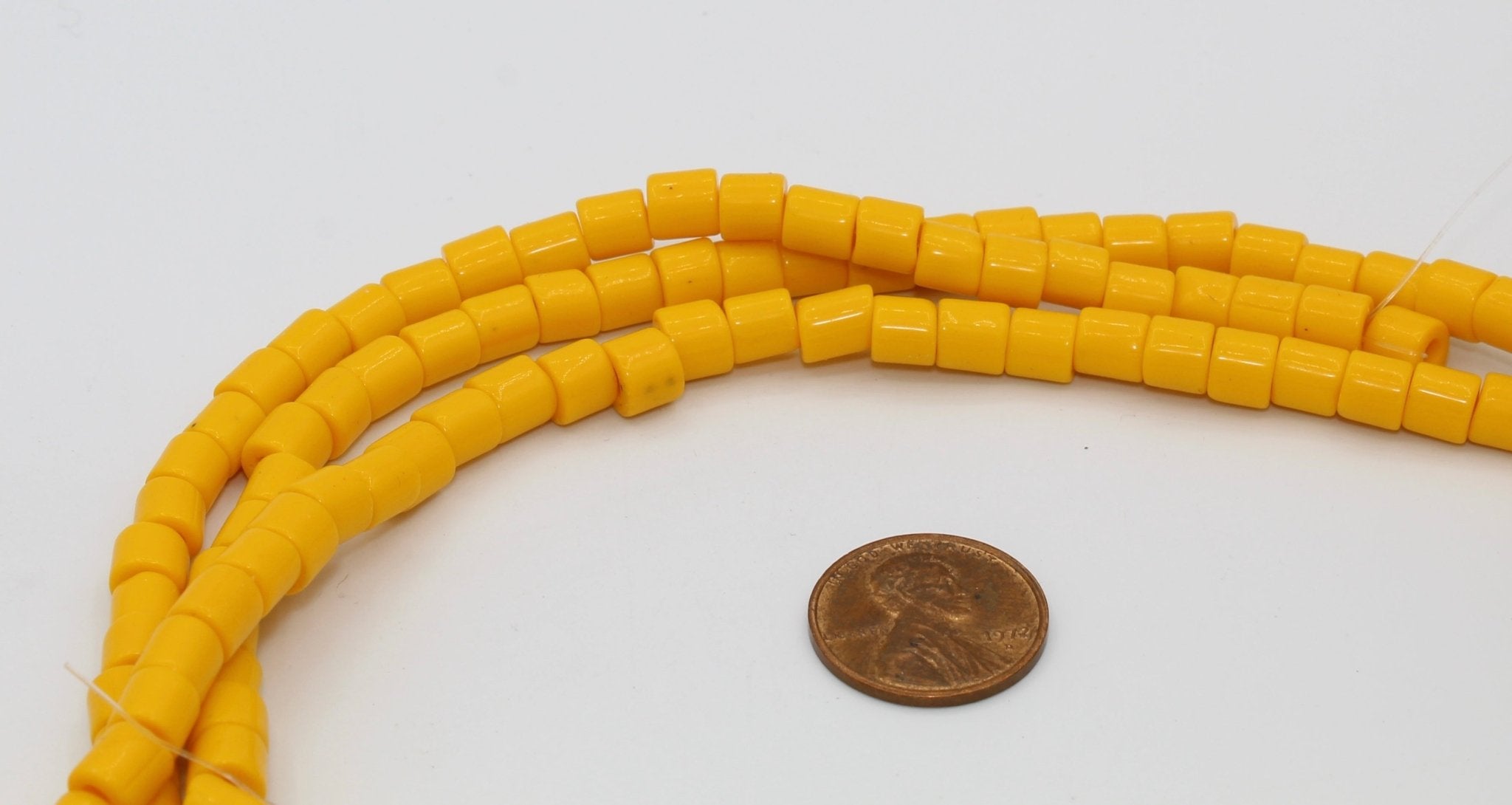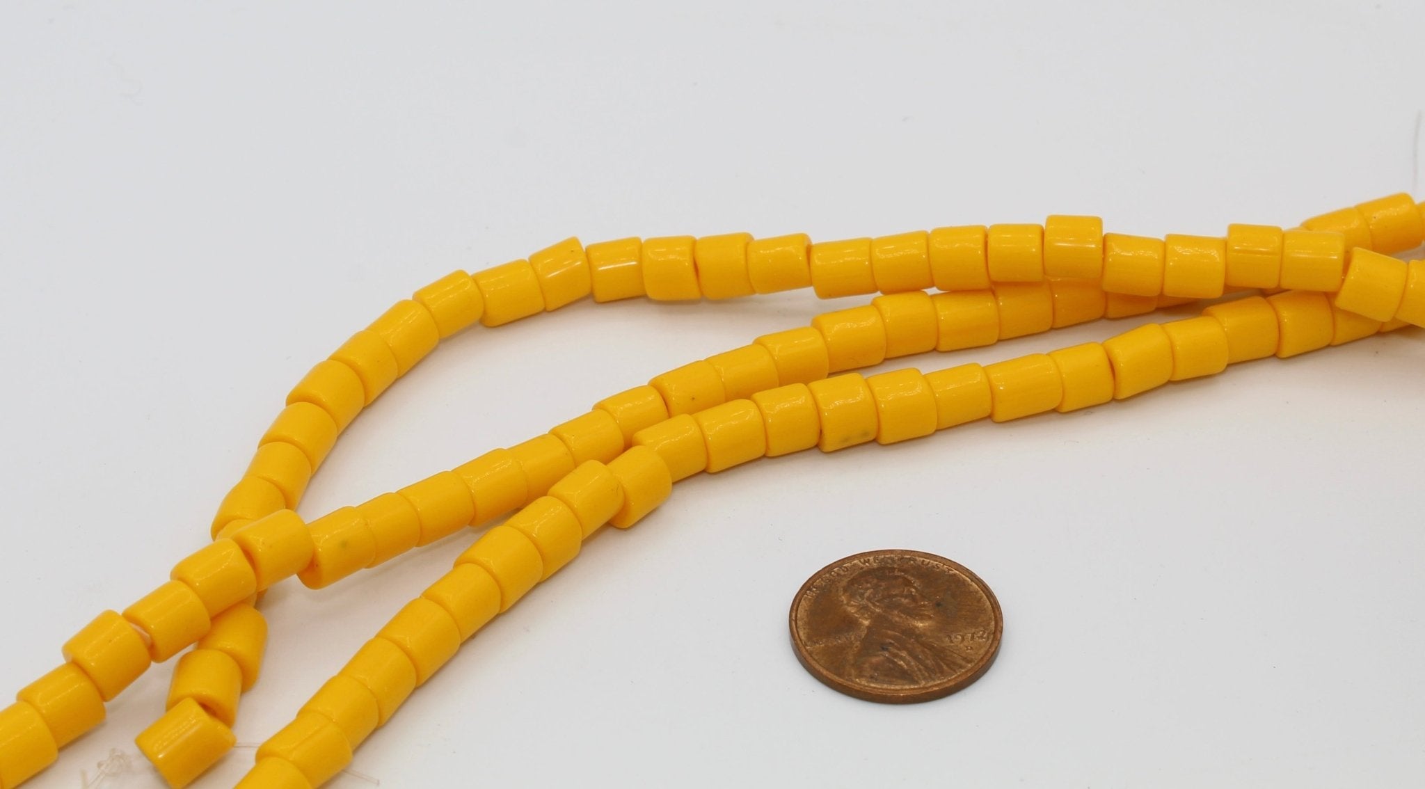 These glass tile beads are cylinder shaped and 6 x 5mm (1/4" x 1/5"). They are traditionally used for chokers, bracelets, necklaces, and spacers.