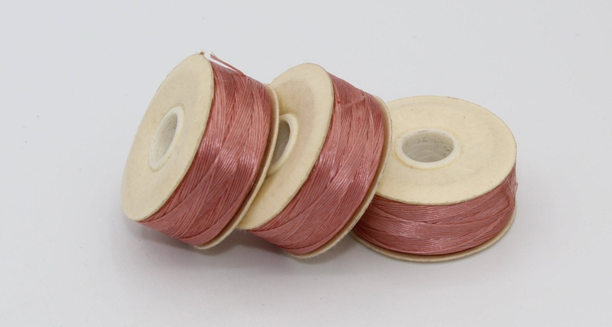 This Nymo thread is sold as an individual bobbin. It is a silver gray color and works well with most colors. Nymo has a bit of stretch to it, making it a good choice for fringe.