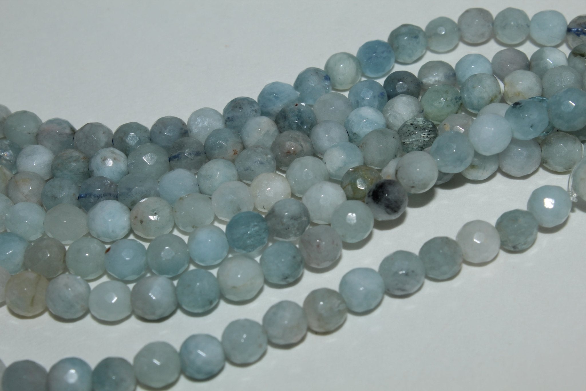 These Aquamarine beads are round, 6mm and faceted. They are light blue with few inclusions.