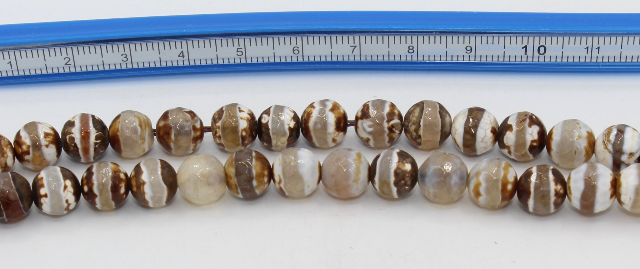 These beautiful Fire Agate beads are round and faceted with a slight striped pattern. The beads are approximately 8mm in diameter.