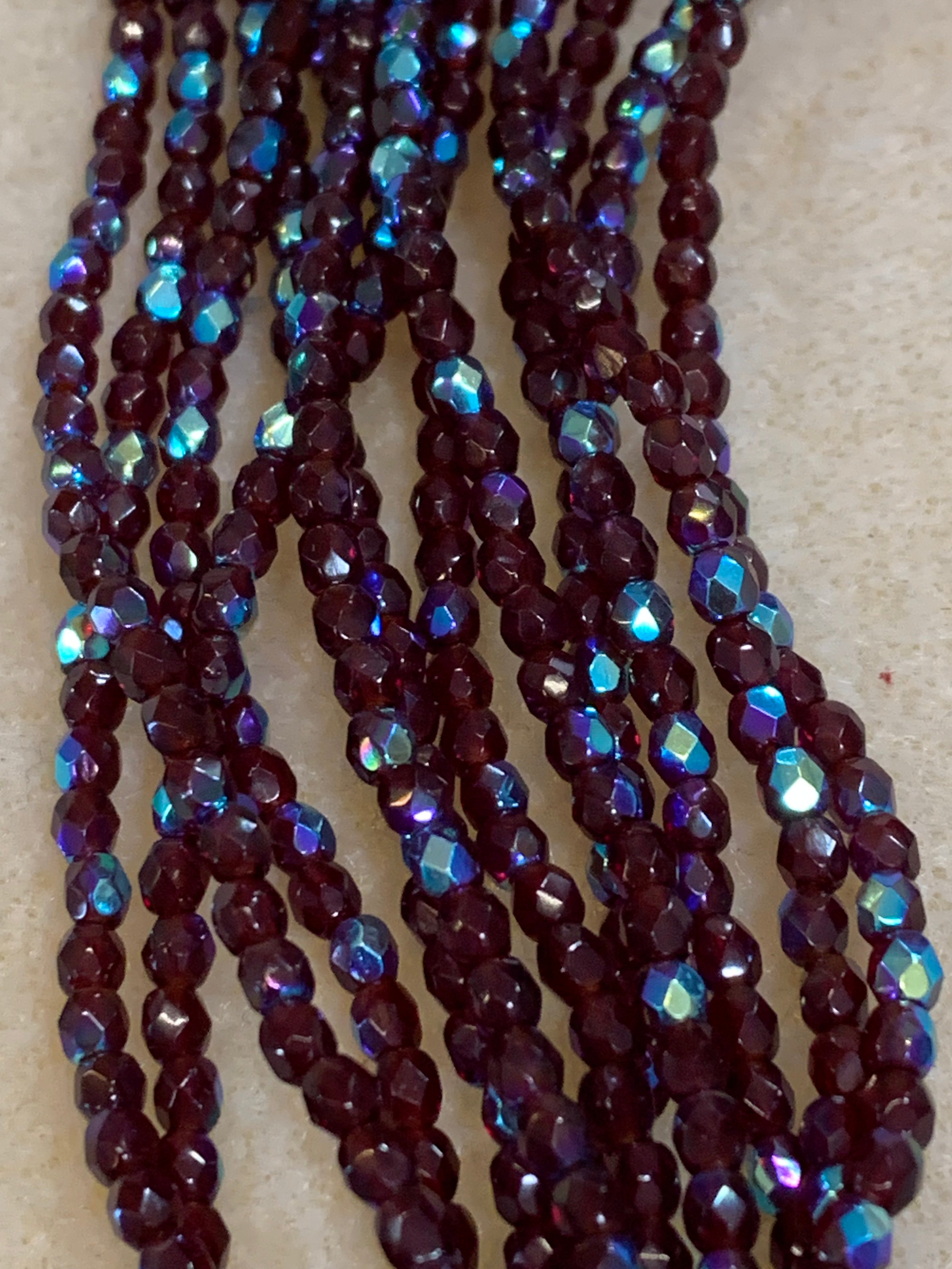 These 3mm Fire Polished beads are sold by the 6" (15cm) strand. Each strand has approximately 50 beads. The hole is approximately .5mm.