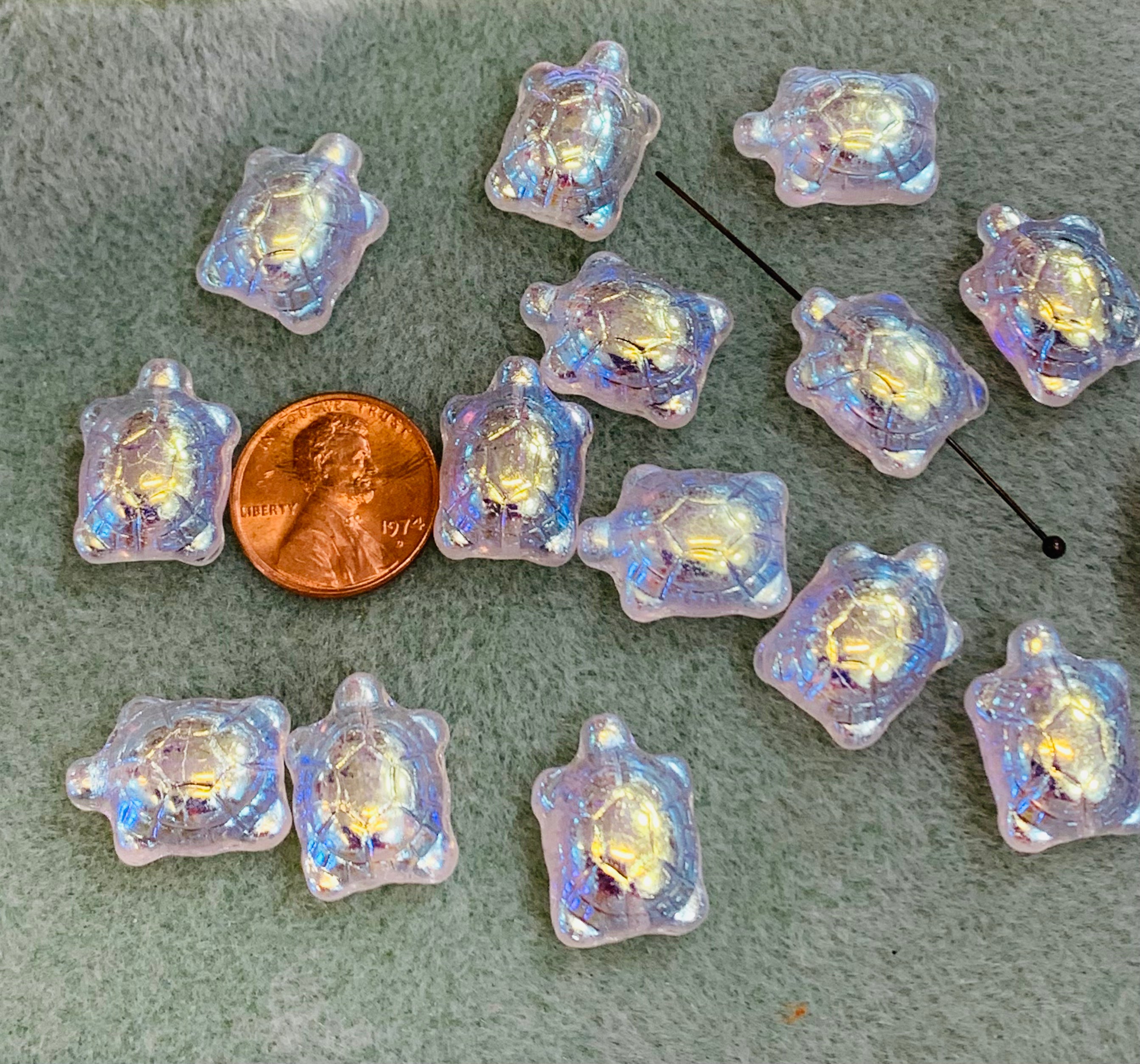These turtle beads are 3/4” x 1/2” (19 x 14mm) with a hole that runs lengthwise (see headpin in picture).
