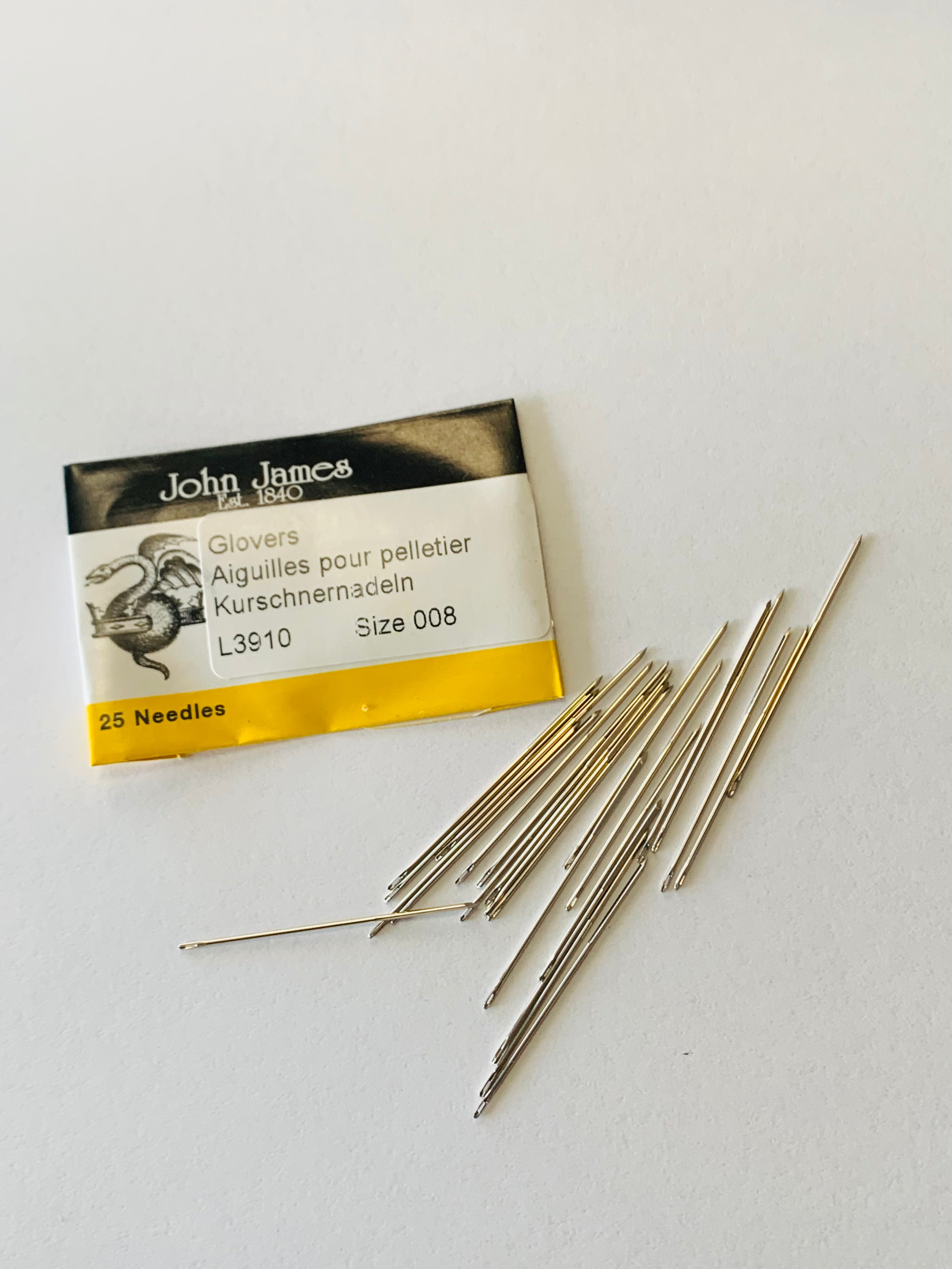 These needles are size 8 which is a medium size of Glovers. They are 1.25" long and meant for light leather work such as medicine bag or jewelry construction.
