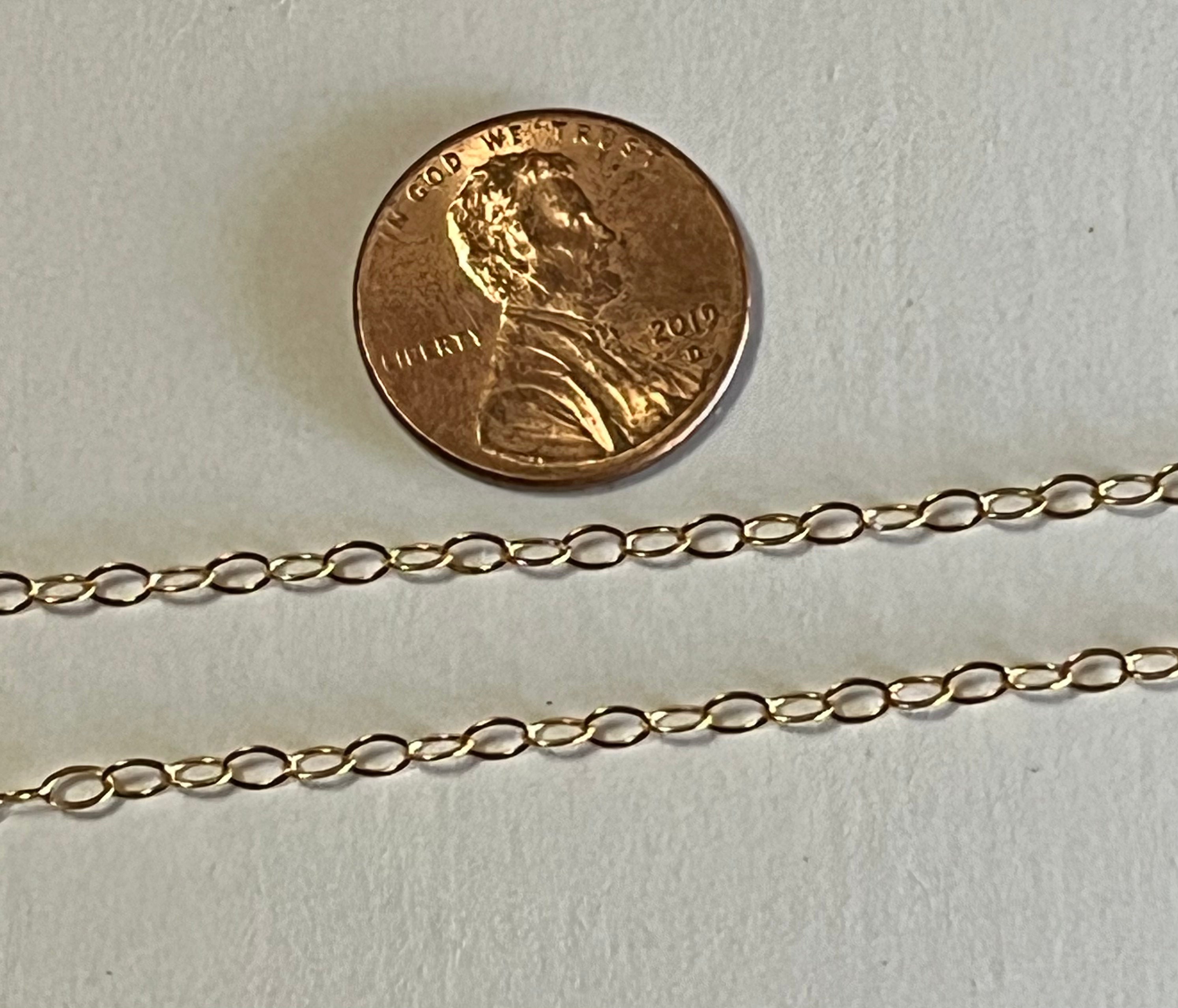 This chain is composed of oval links that are 3mm x 2mm (.07” x .1”). All rings are soldered shut.