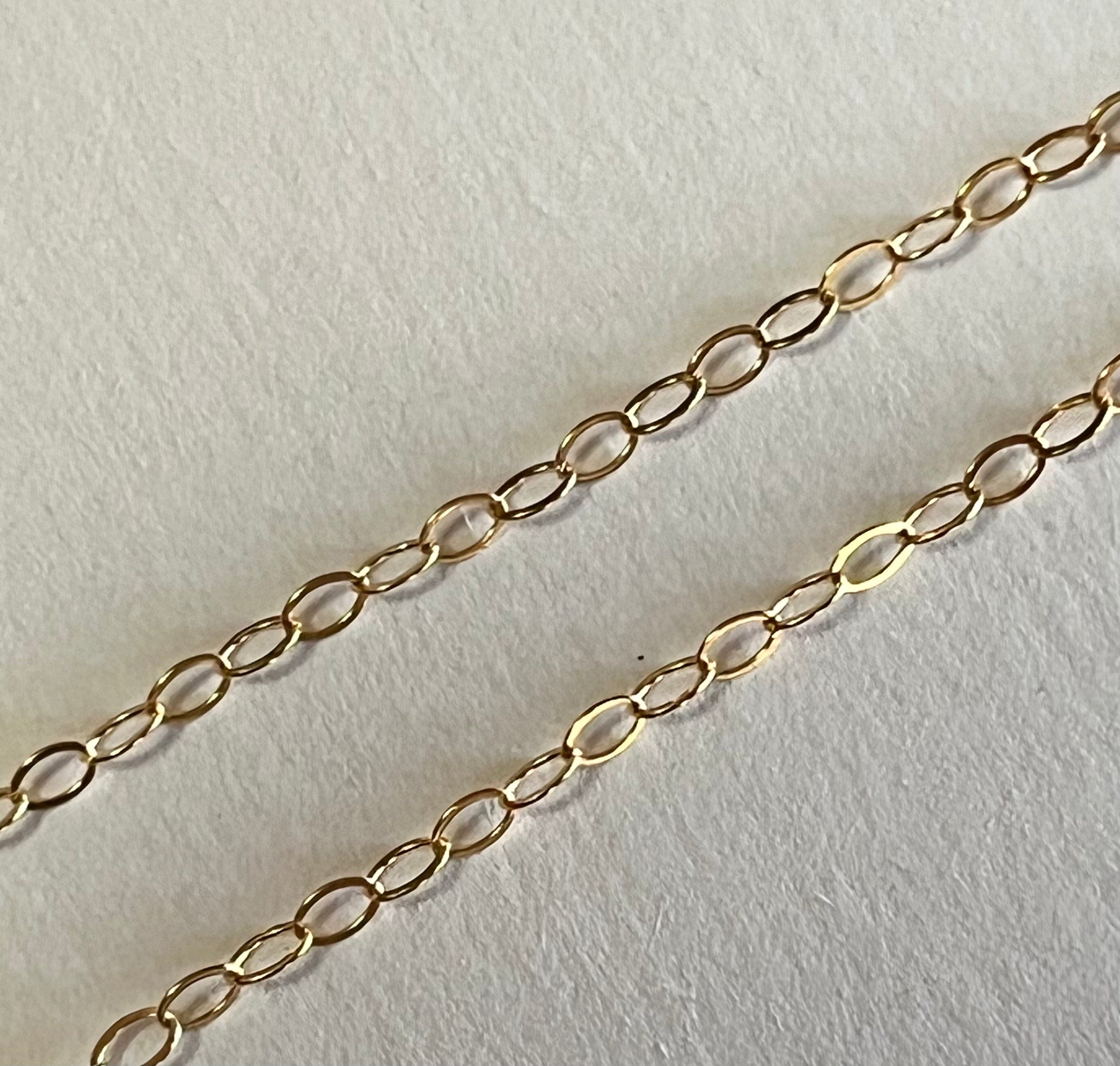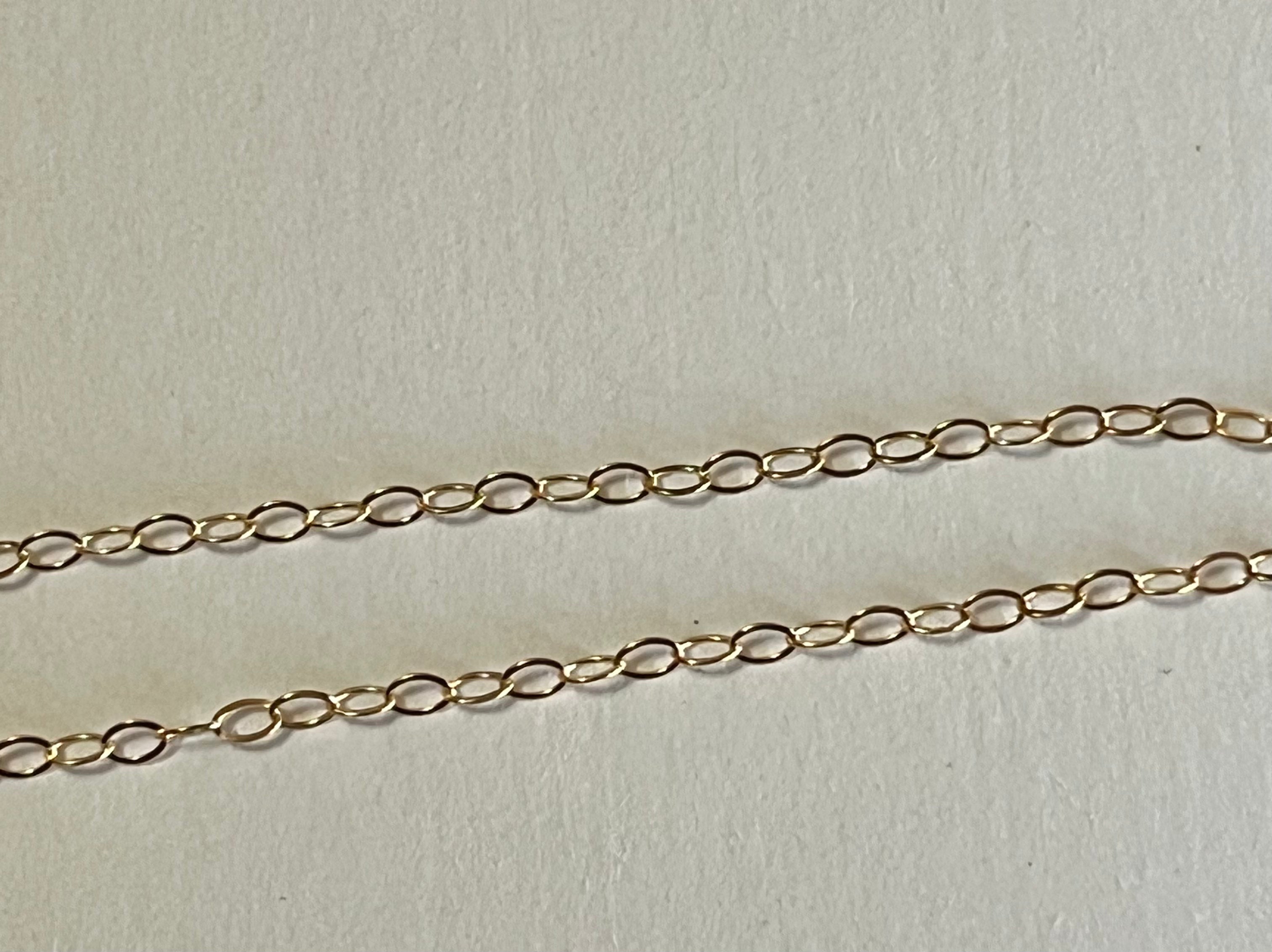 This chain is 14k gold fill. Gold fill means a solid layer of 14k gold fused onto a brass core - it is far better quality than gold plate.