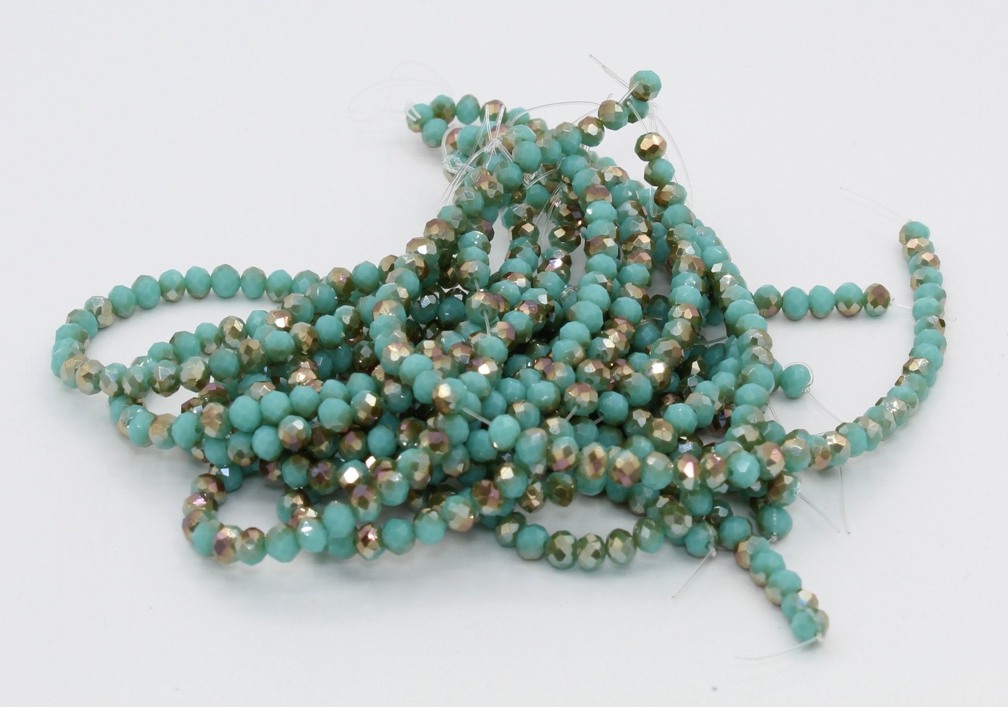 These faceted glass rondelles are 3 x 4mm. They are sold as a 14" strand with approximately 104 beads.