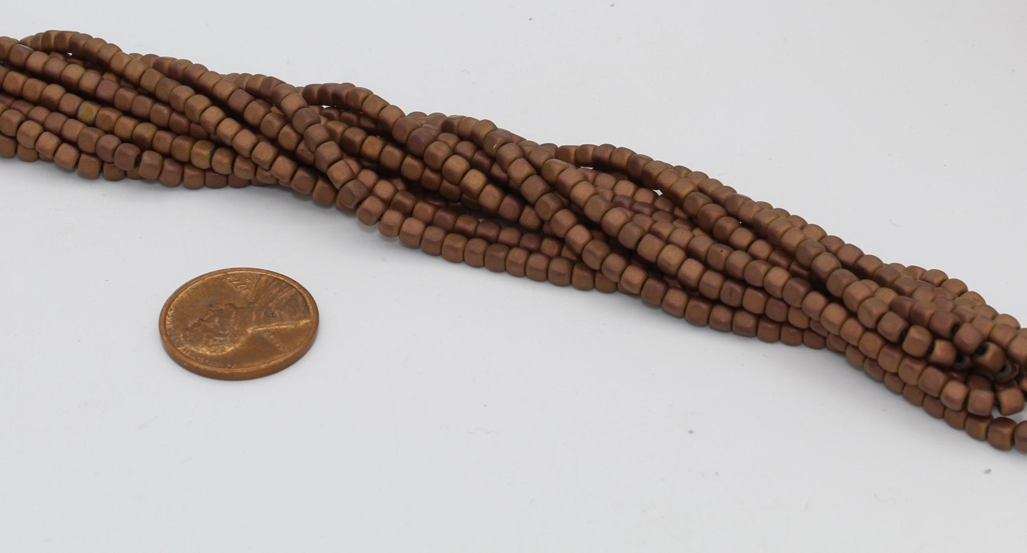 These Hematite beads have a matte copper finish. They are 3mm cubes with gently rounded sides.