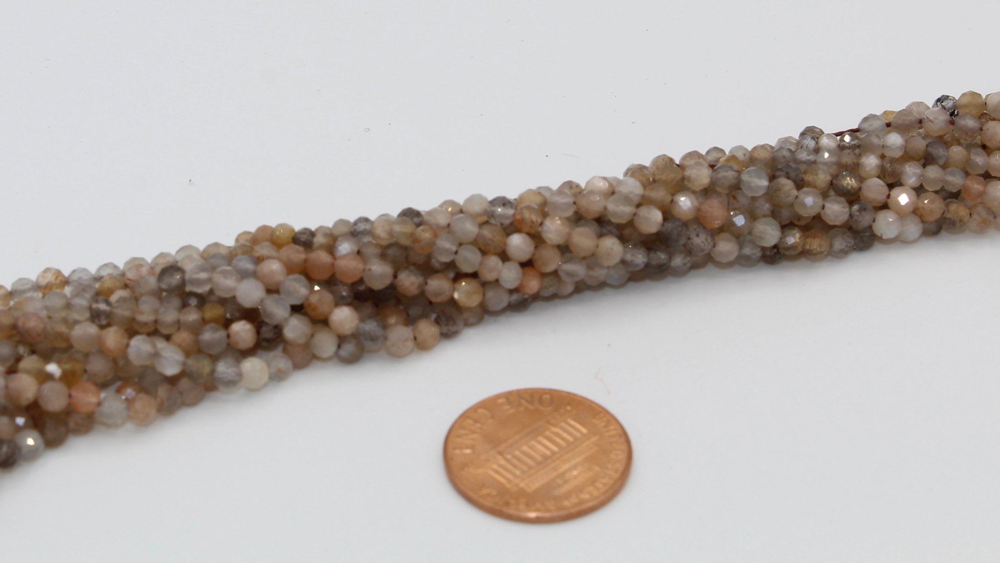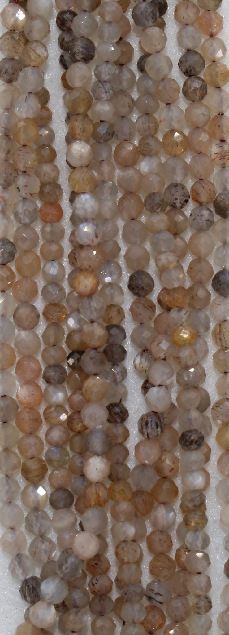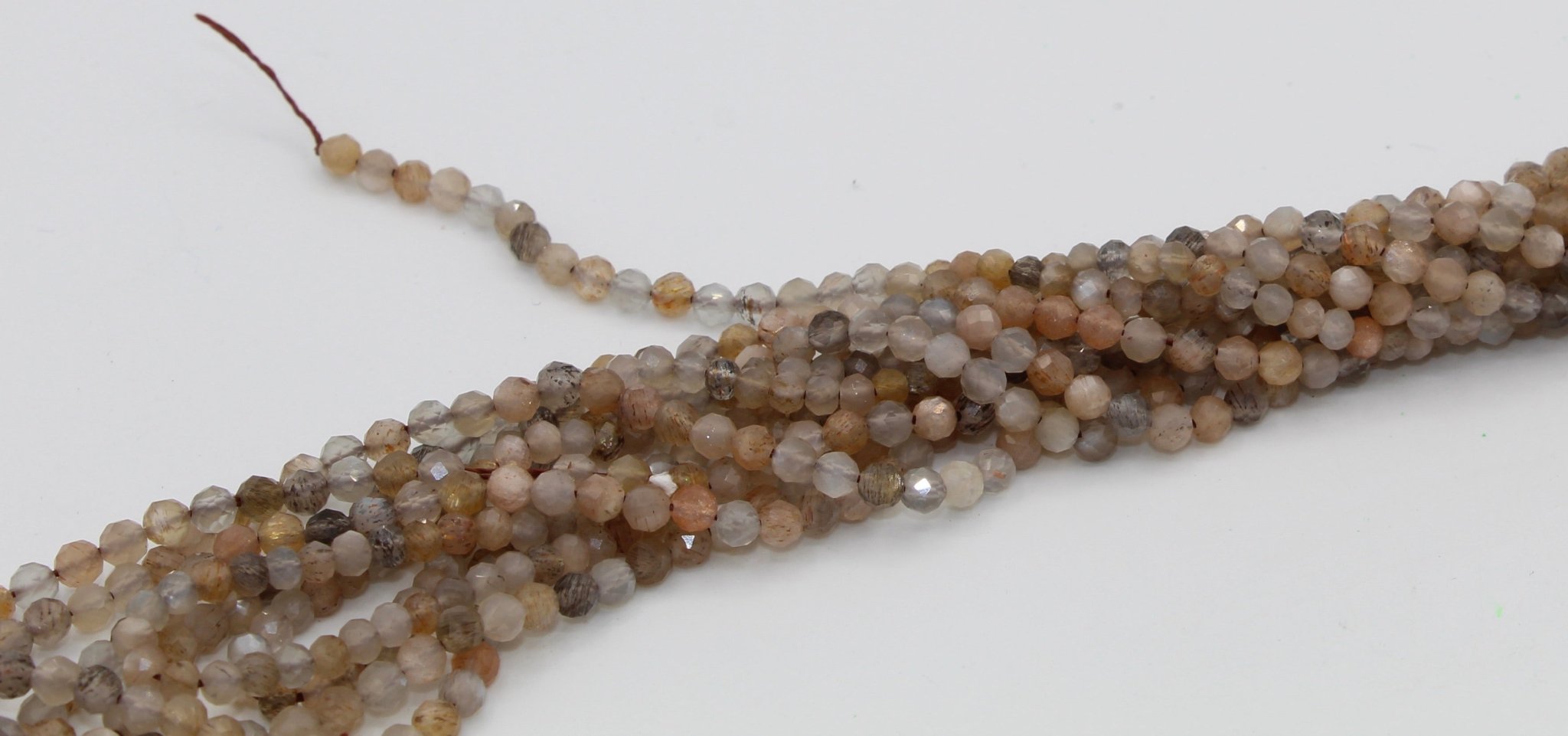 These micro-faceted Moonstone beads have a variety of warm gray, peach and quartz tones. They are approximately 2.5mm each.