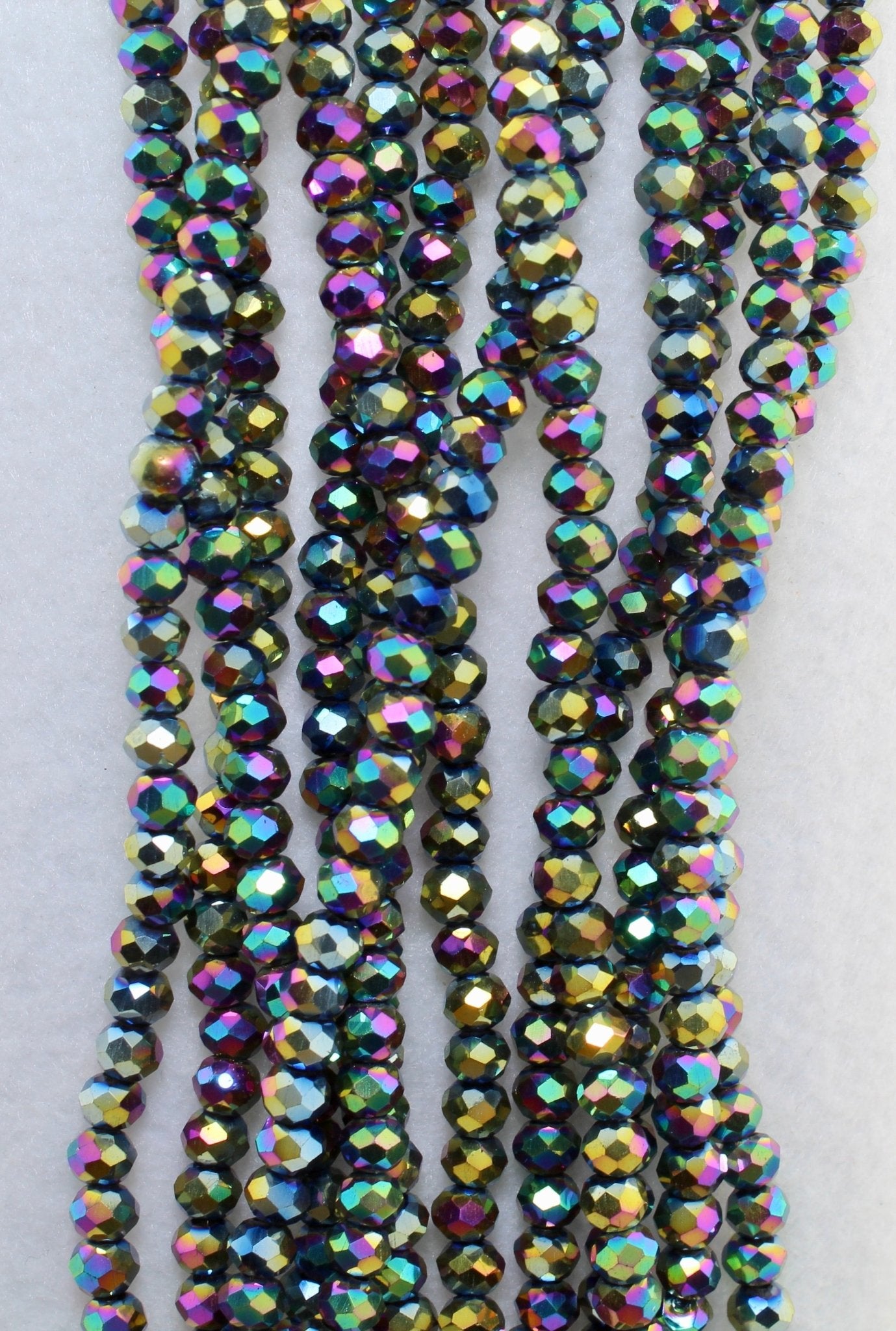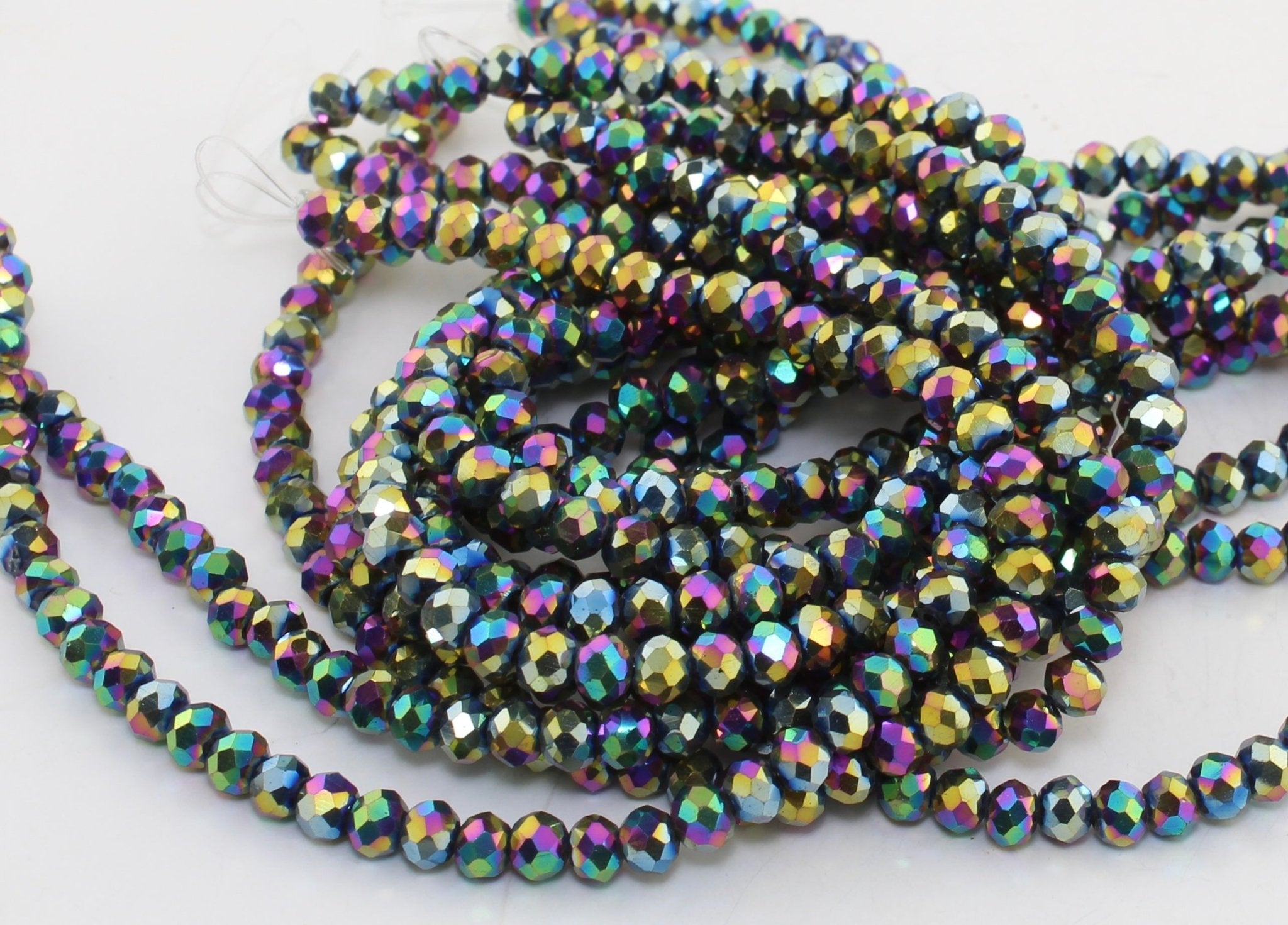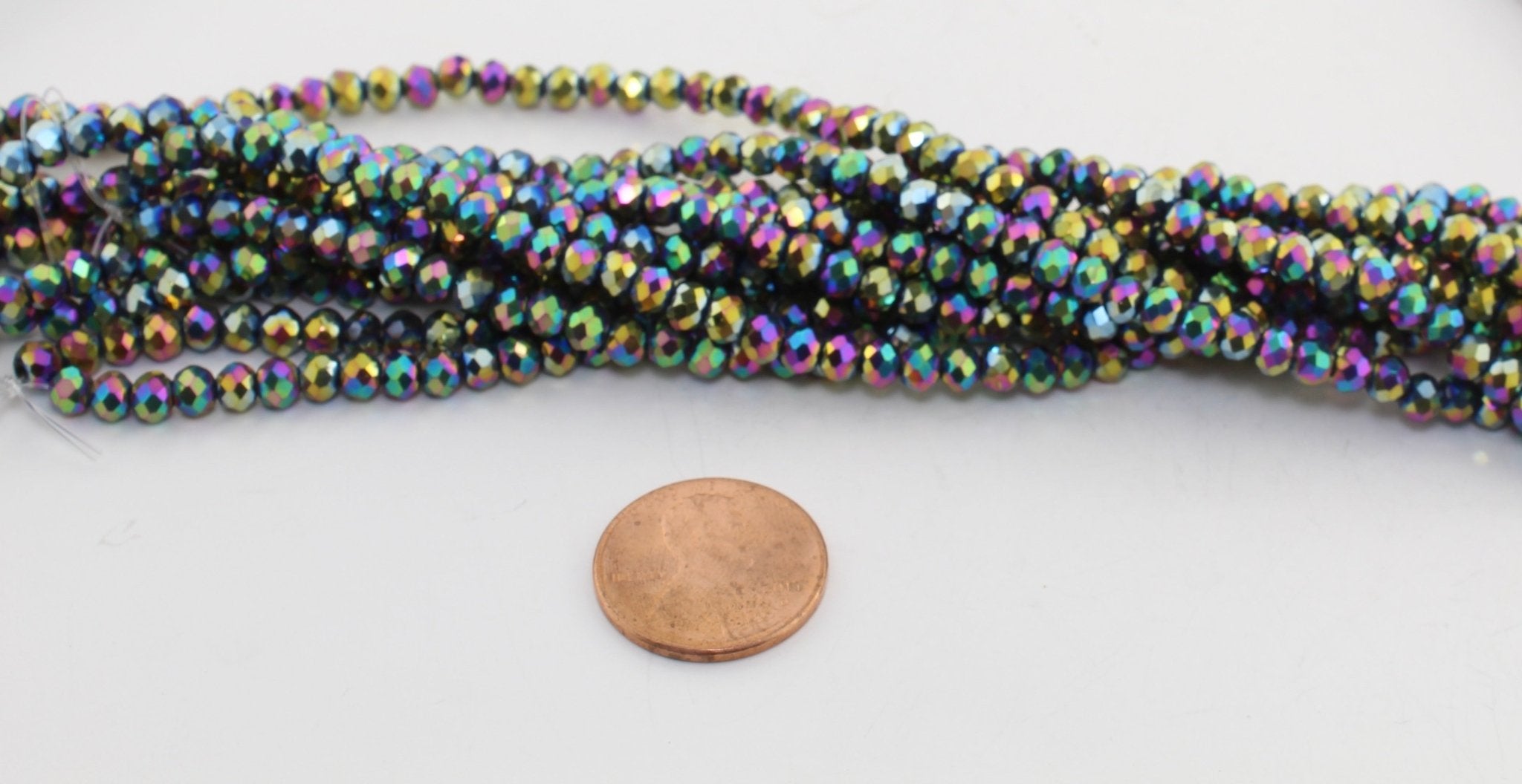 These faceted glass rondelles are 3 x 4mm. They are sold as a 14" strand with approximately 104 beads.