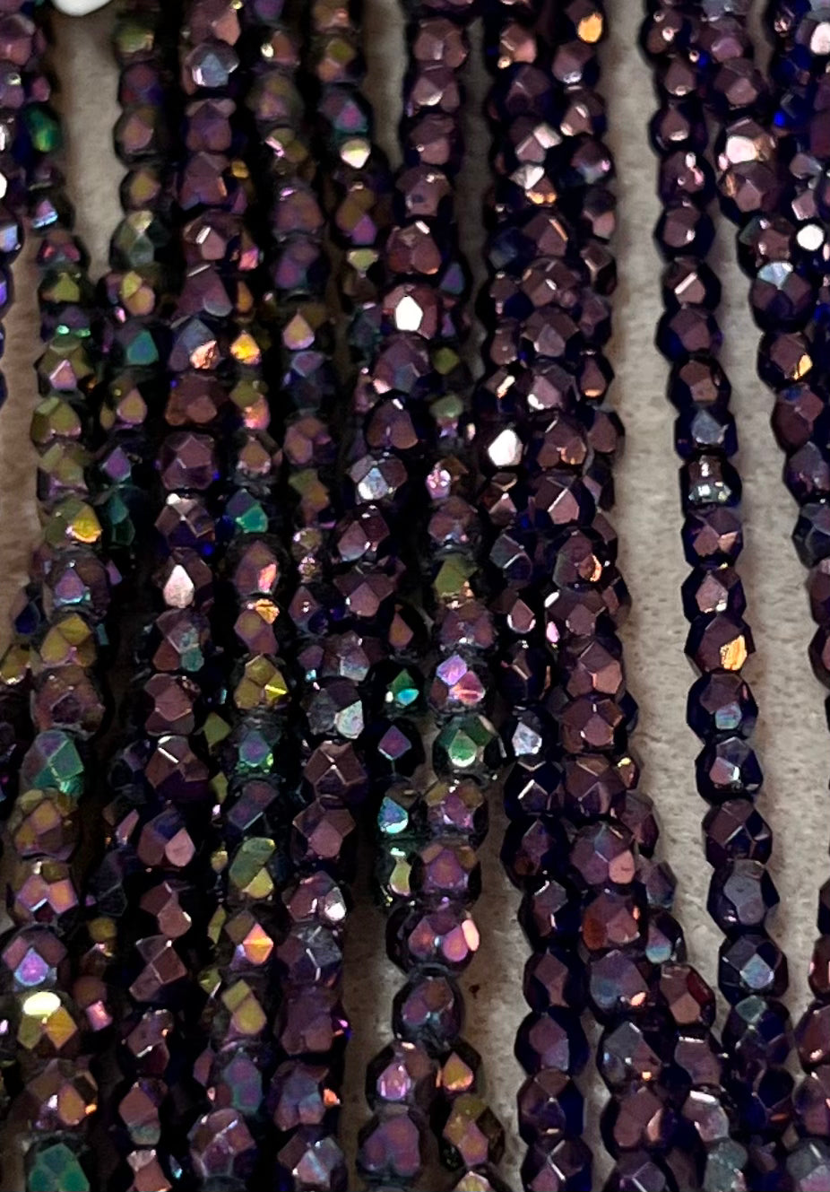 These 3mm Fire Polished beads are sold by the 6" (15cm) strand. Each strand has approximately 50 beads. The hole is approximately .5mm.