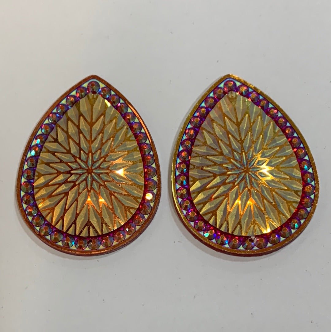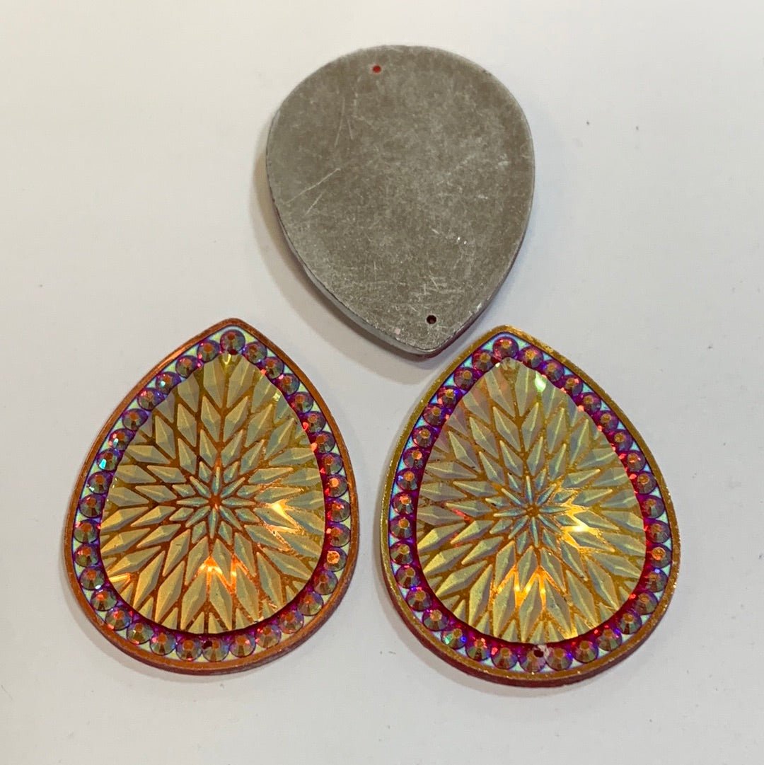 These resin centerpieces are 30 x 40mm flat backs. They are sew down crystal centers with 2 holes.