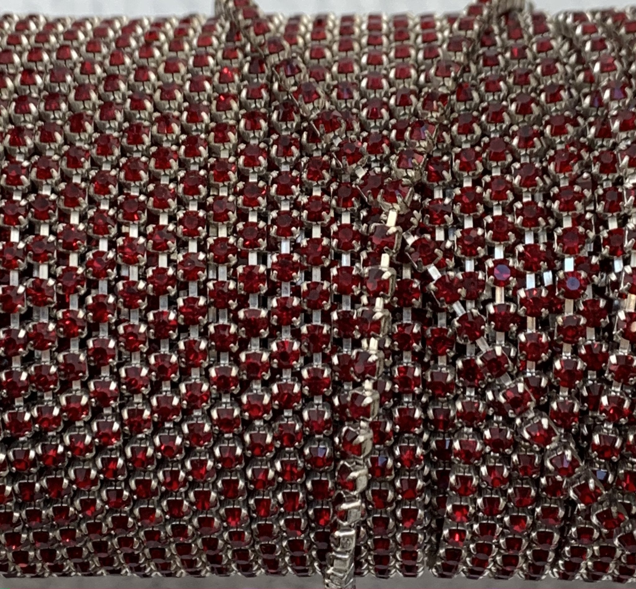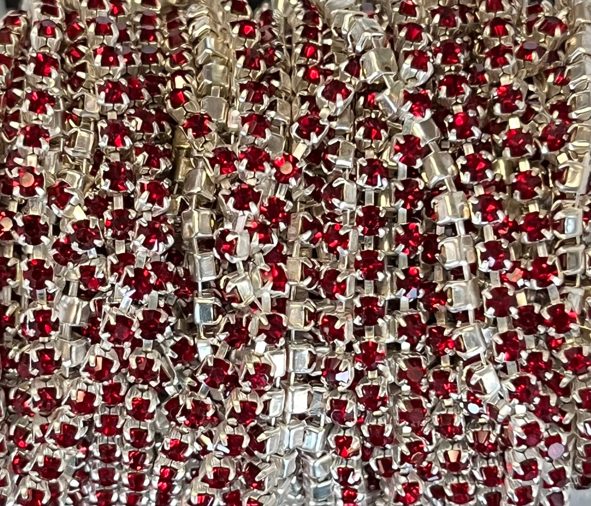 This metal banding has red siam crystals set in silver plated metal banding. It is size 8.5 ss (2.5 mm crystal width). It is sold by the foot.