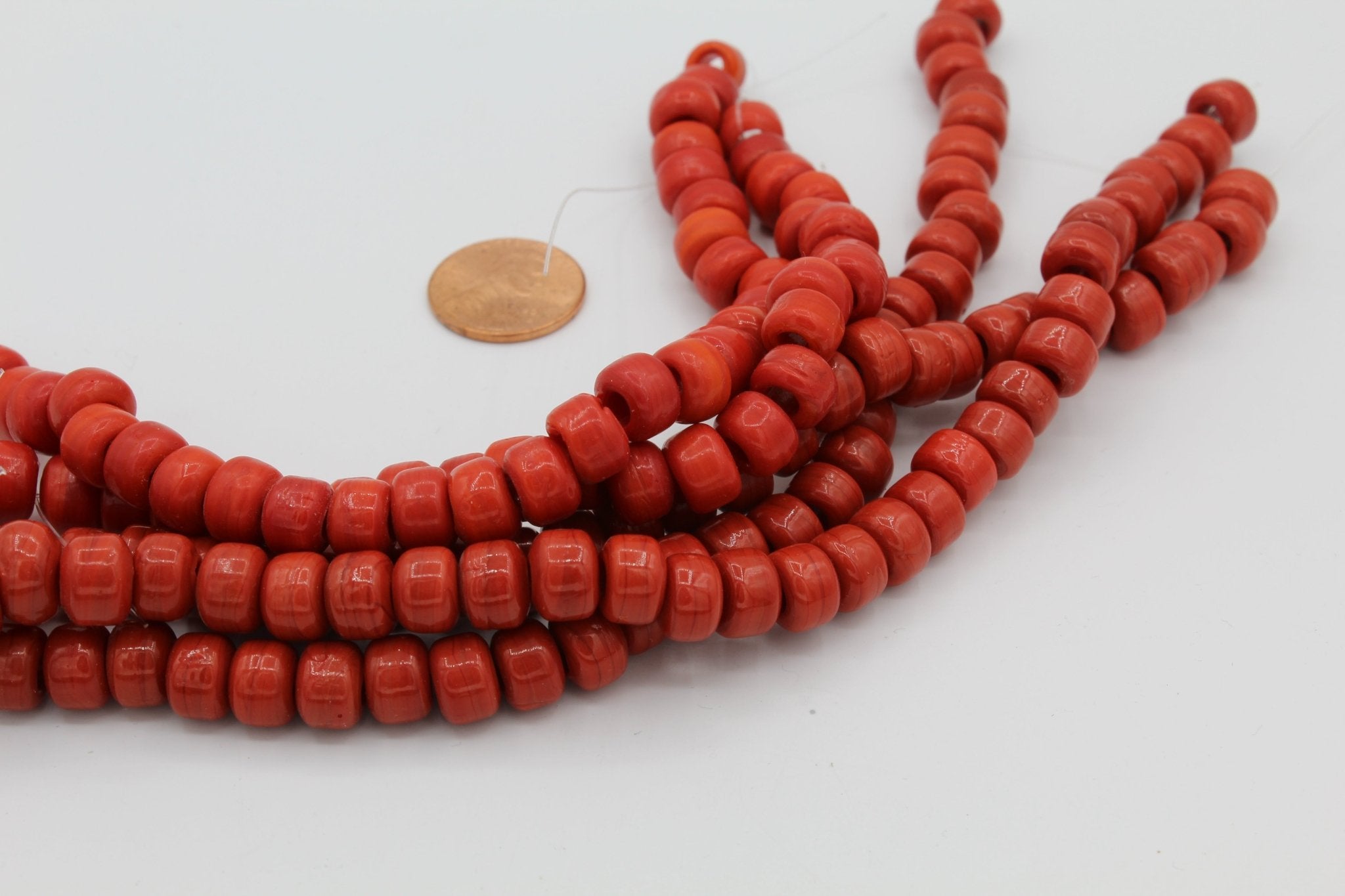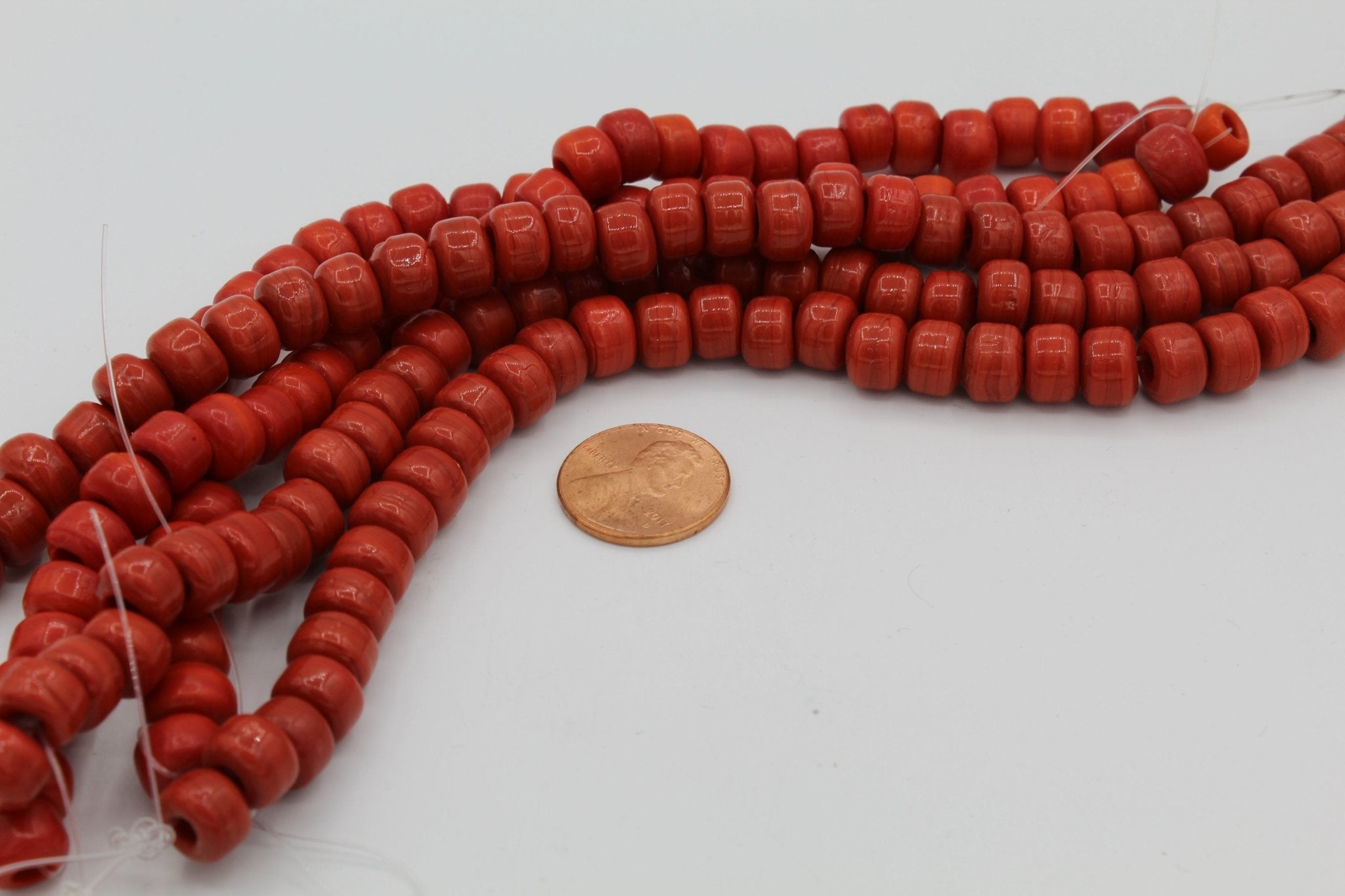These are glass standard size Crow beads. Standard size Crow beads refer to a particular size of bead (6 x 9mm wide with a 2.5 mm hole) used in traditional Native beadwork.