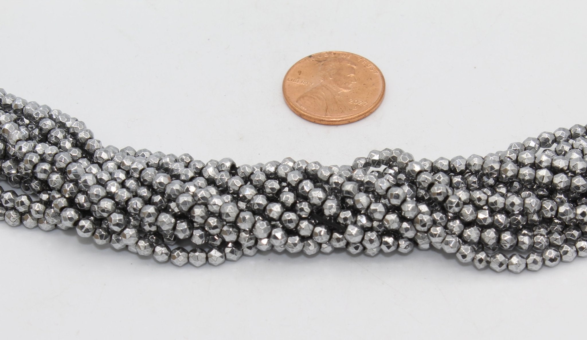 These Hematite beads have a silver finish and are faceted on the edges. They are 3mm round beads.