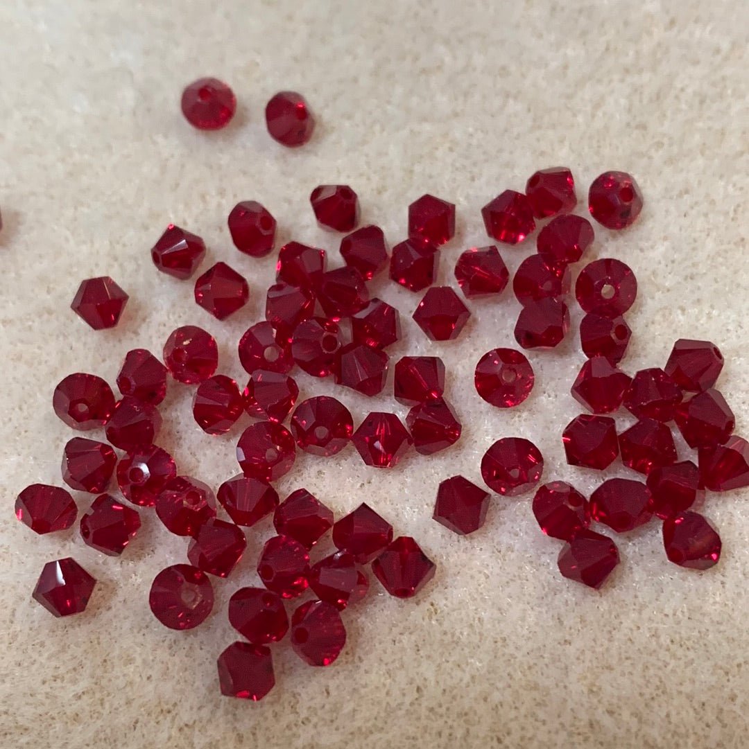 These Swarovski Crystal bicones are Siam (dark red) colored. They are sold in a 1/2 gross package (72 beads).