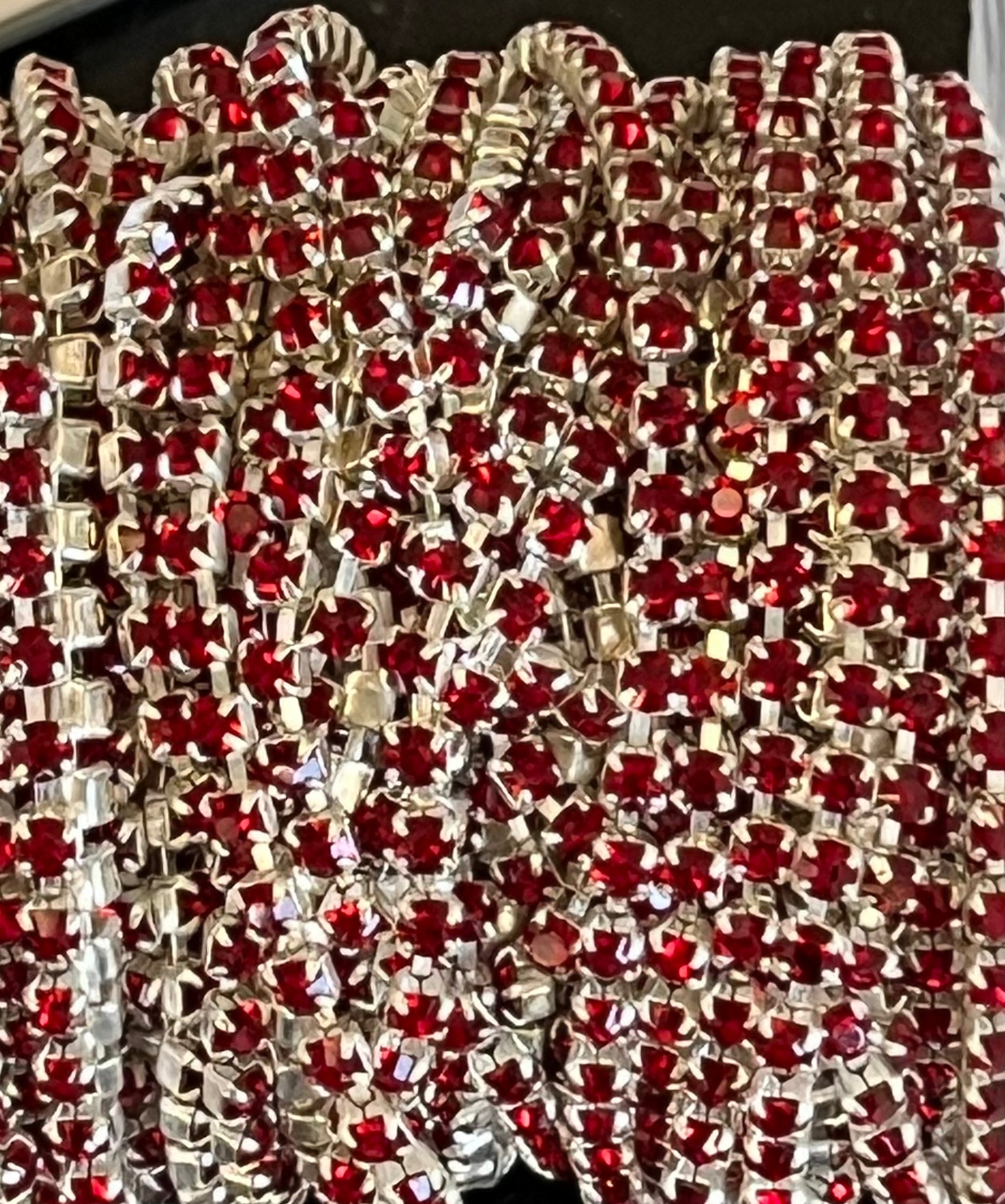 This metal banding has siam red crystals set in silver plated metal banding.