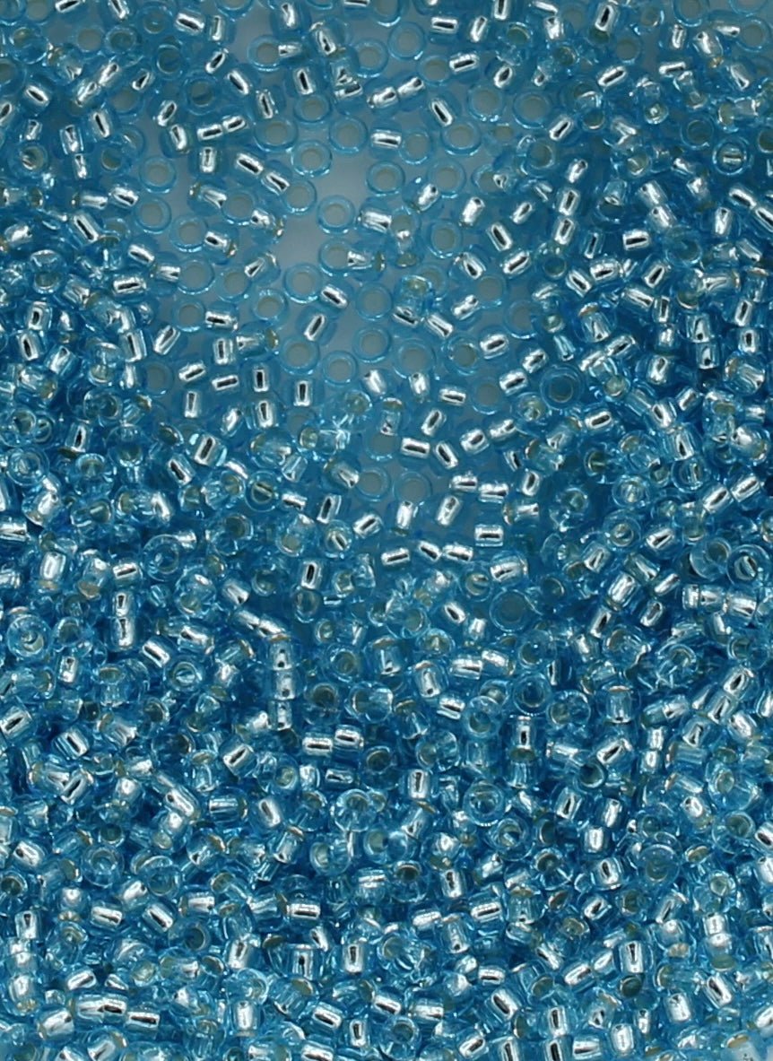Size 15/0 Toho seed beads measure 1.5mm x. 1.3mm with a .7mm hole size. They are sold in a 14 gram tube (approximately 4090 beads). They are slightly more tubular than round (Miyuki size 15/0 are more rounded.)