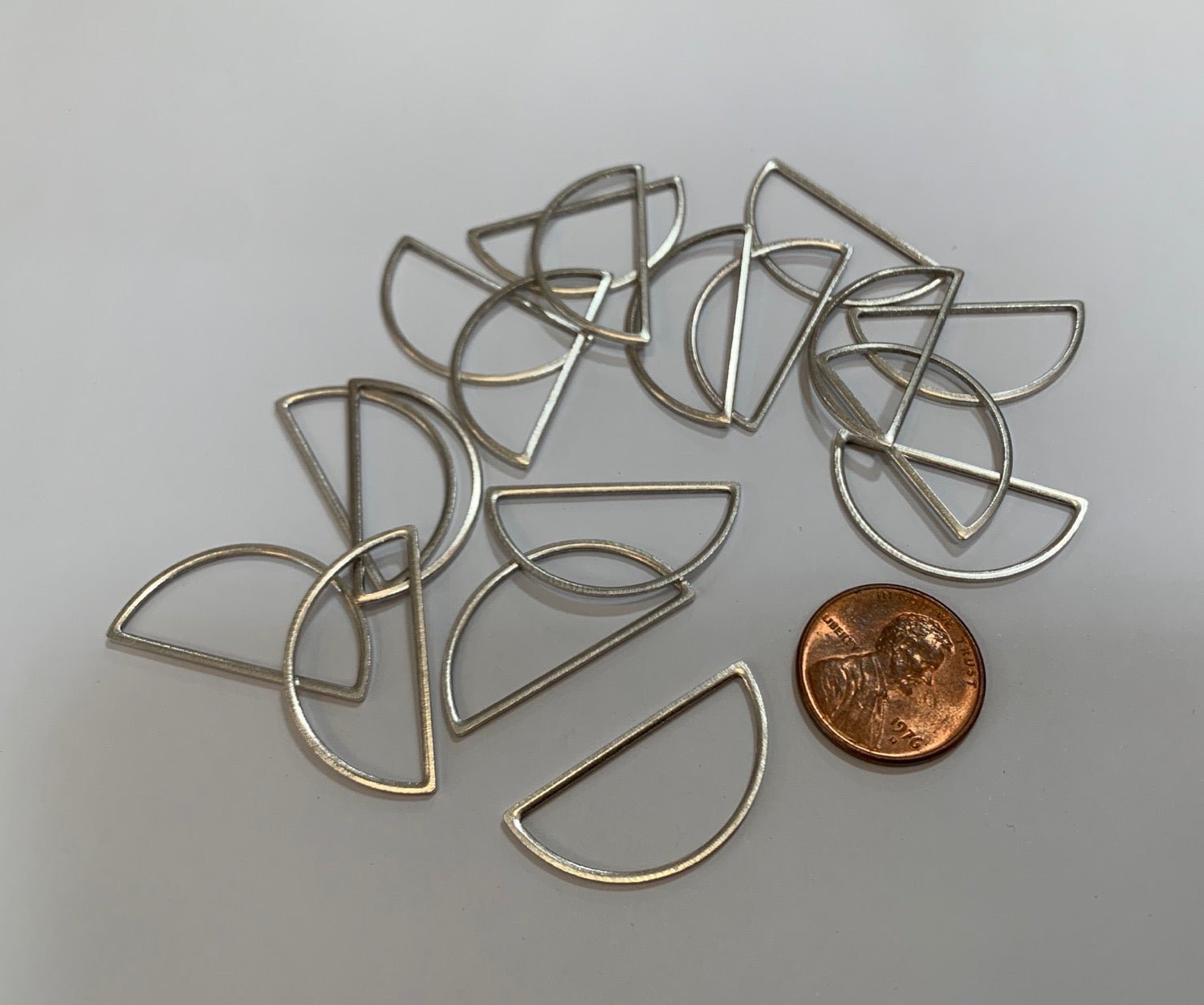 These half circle metal links are silver plated brass. They are 14 x 28 x 1m (1/2 x 1”). They are sold as a pair.