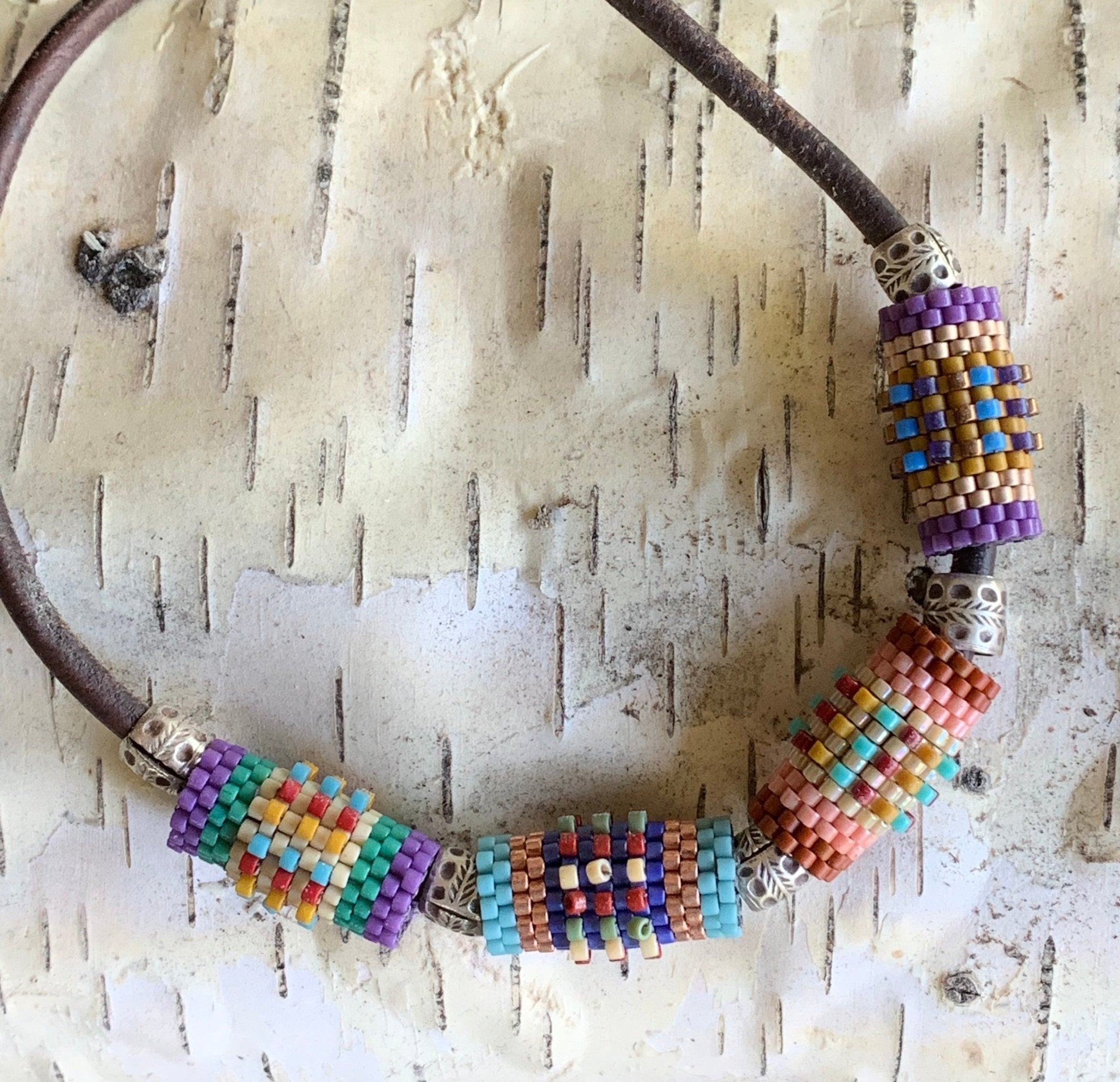 The Surrounded by Silver Necklace instructions teach the bead weaver to create beaded beads using odd count peyote stitch and stitch in the ditch. Pictures demonstrate how to master the odd count peyote stitch turnaround at the end of the row, which is always challenging.