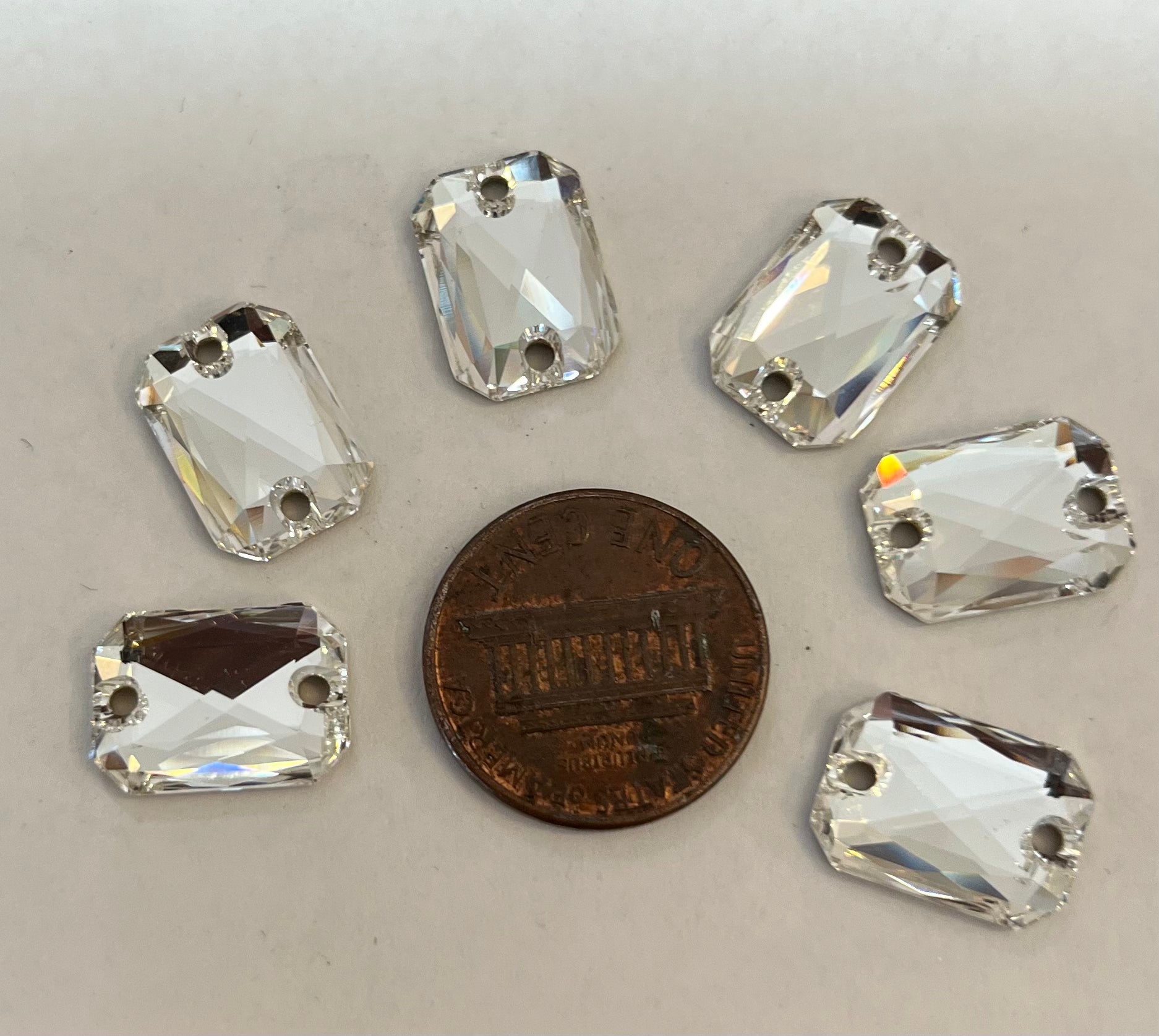 These are sew down flat back crystals from Swarovski. They are 14 x 10mm in diameter, with 8 edges, two holes and a silver foil backing.