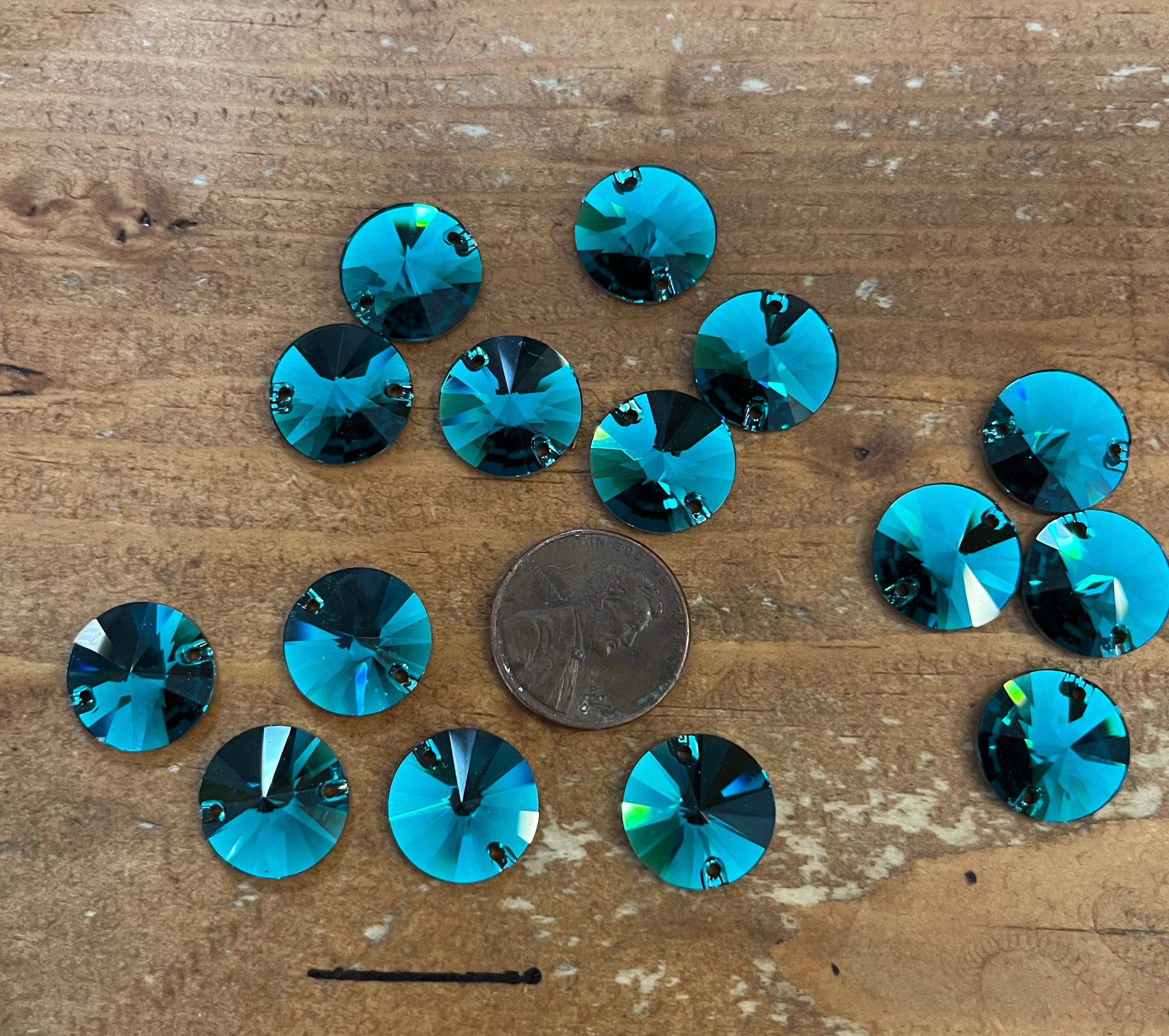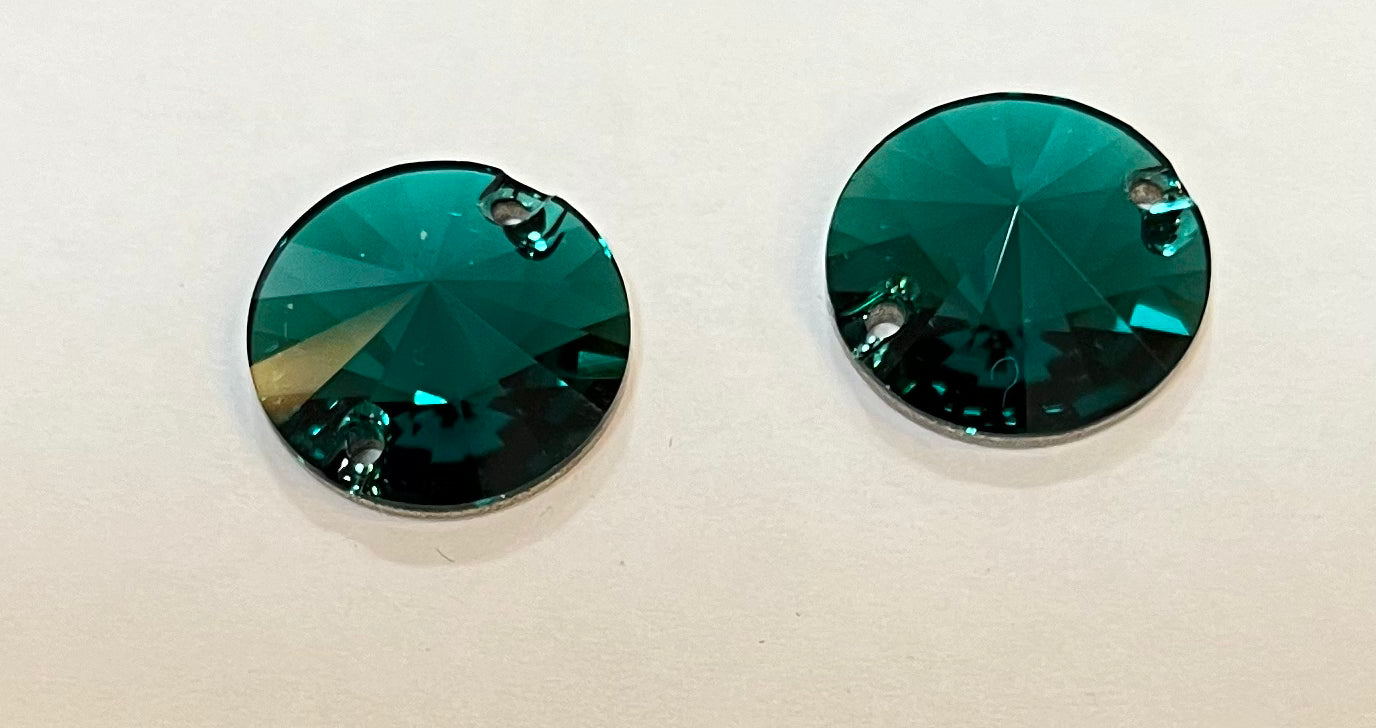 These Swarovski crystal flat backs are 14mm rounds. They have two holes and a silver backing.