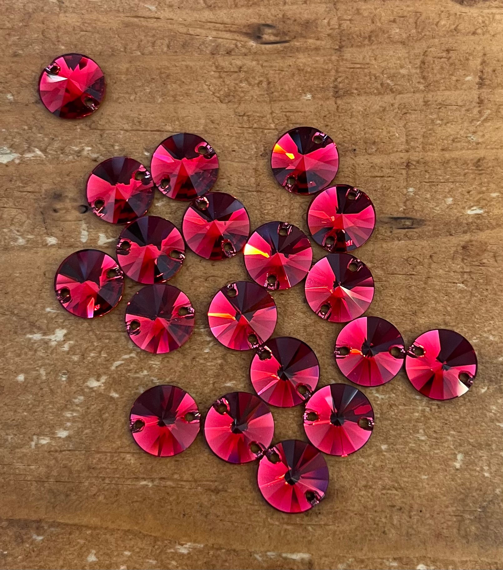 These are sew down flat back round crystals from Swarovski. They are 10mm in diameter, have two holes and a silver foil backing.