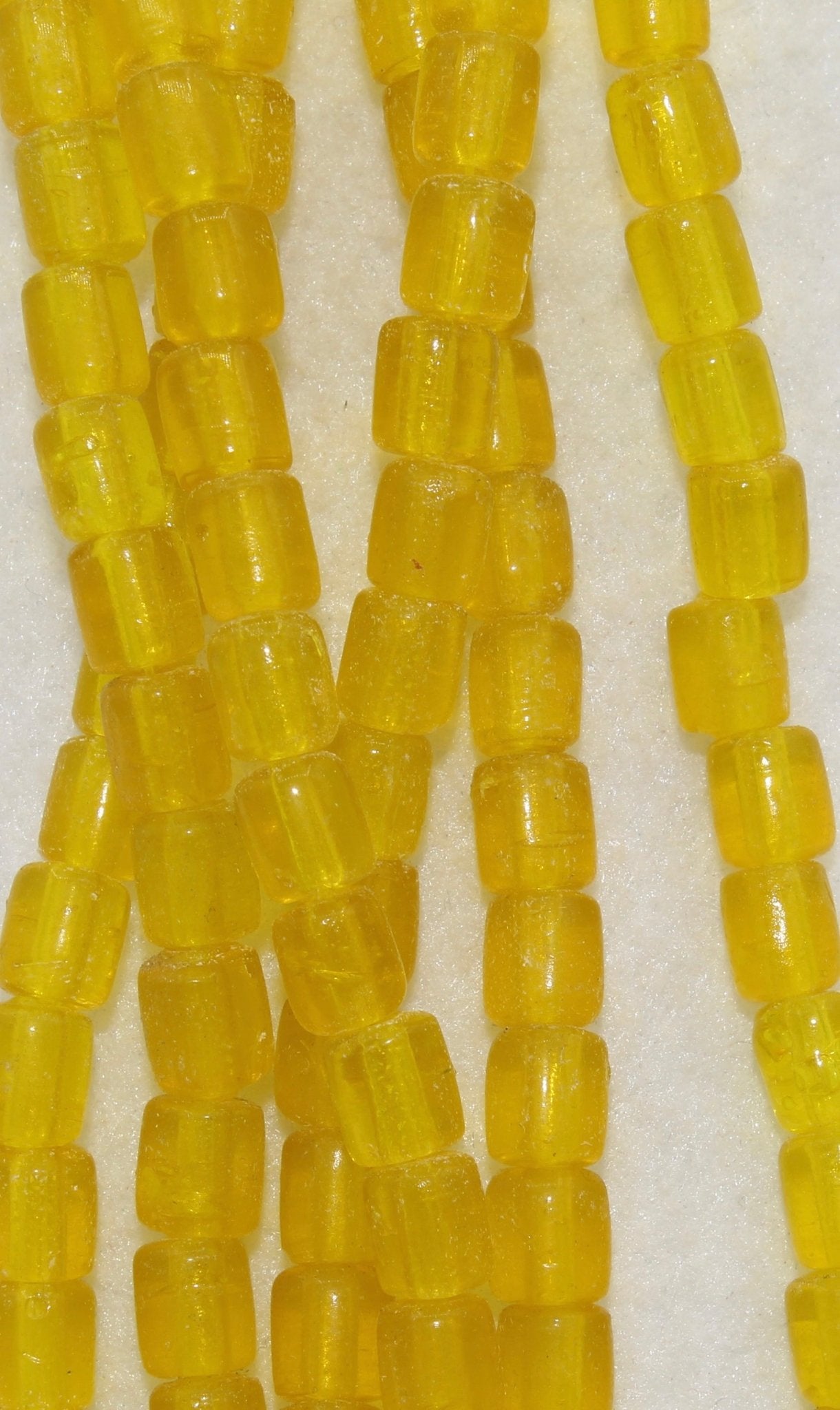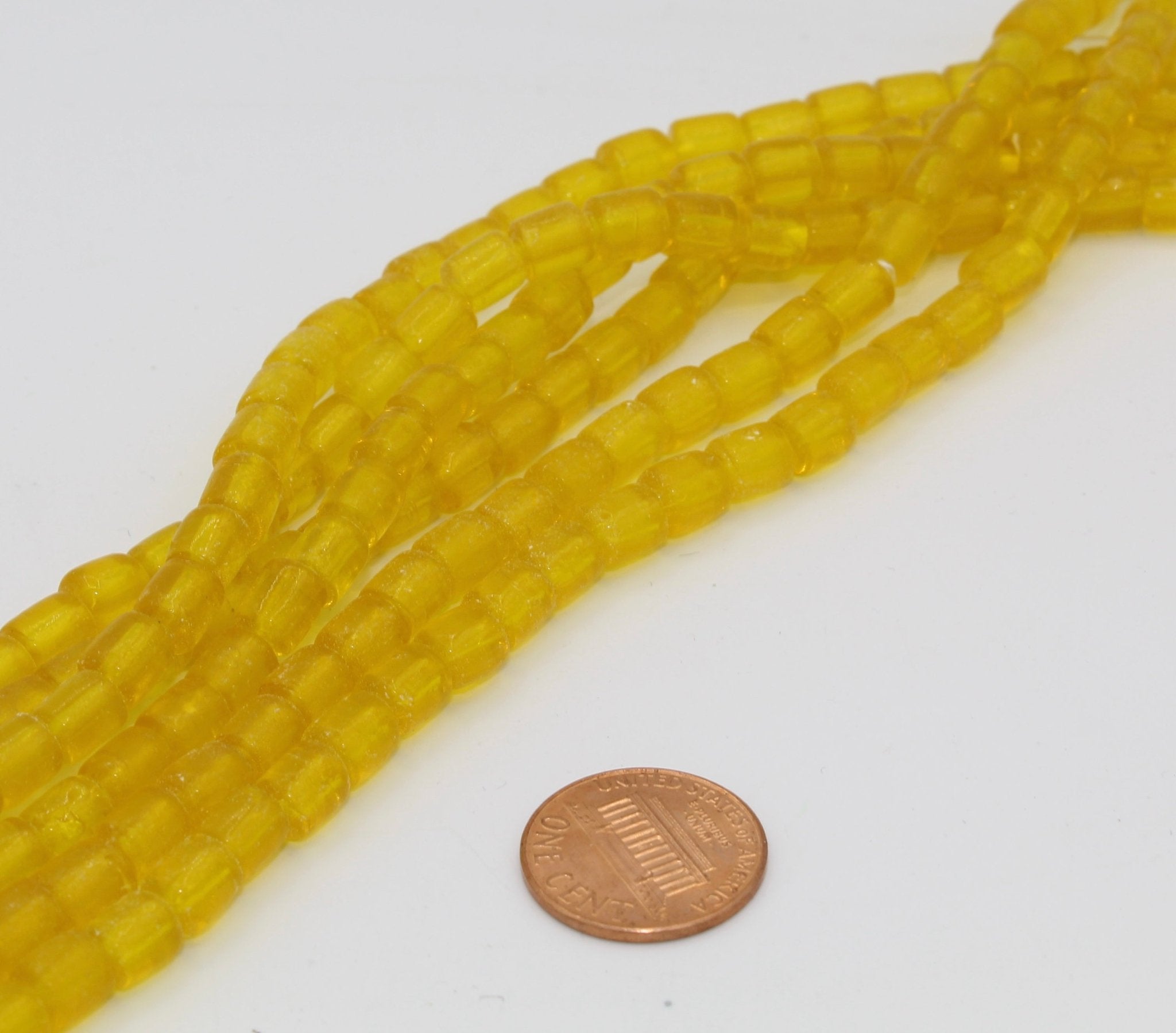These glass tile beads are cylinder shaped and 6 x 5mm (1/4" x 1/5"). They are traditionally used for chokers, bracelets, necklaces, and spacers.