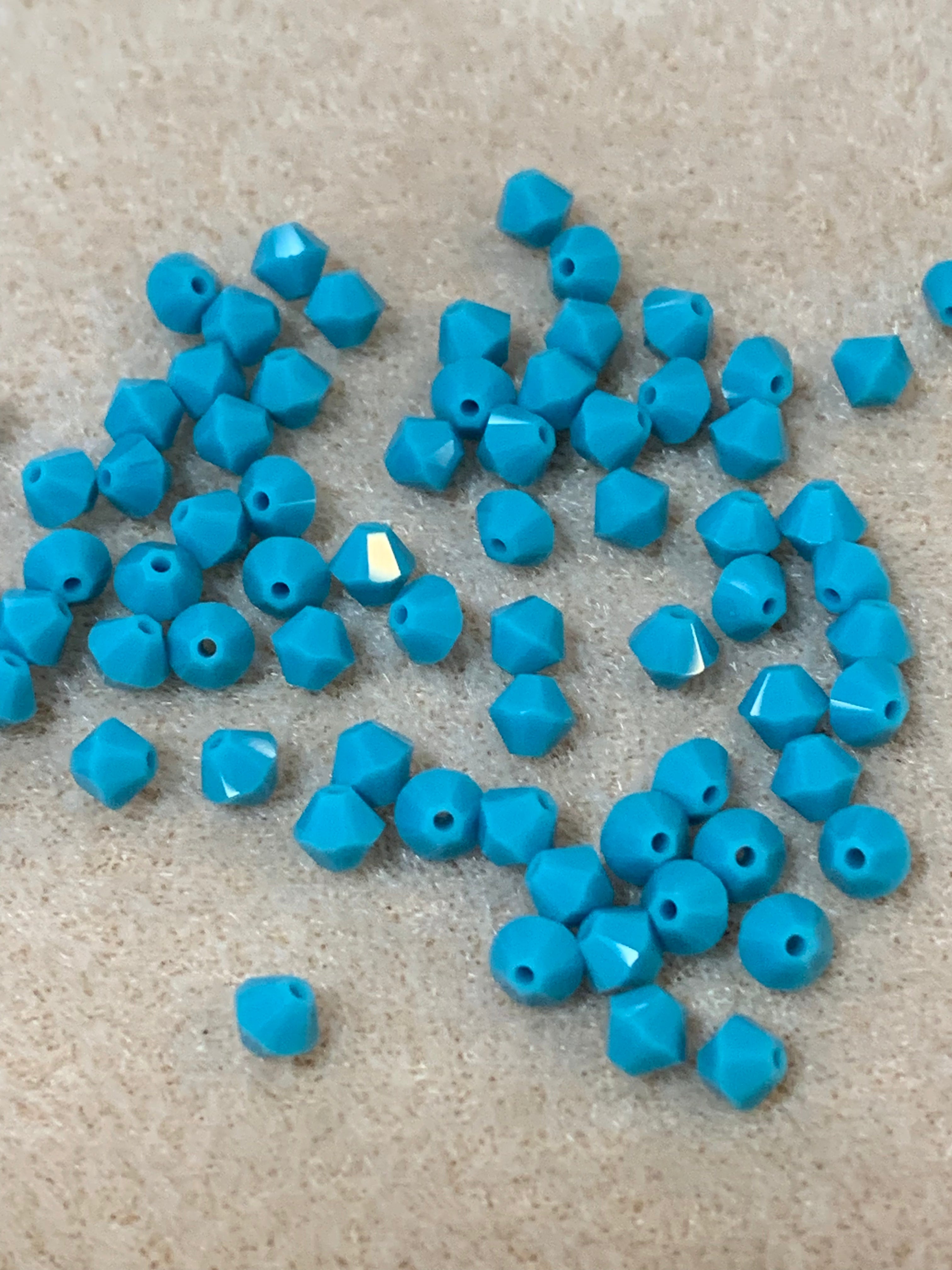 These Swarovski Crystal bicones are opaque turquoise colored. They are sold in a 1/2 gross package (72 beads).