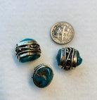 These turquoise beads with a hand formed sterling band are approximately 20mm x 15mm with a hole drilled vertically through the stone. They are sold individually. Each one is unique - please allow for some variation. They are primarily blue toned turquoise. Add one of these to a necklace to make it unique.