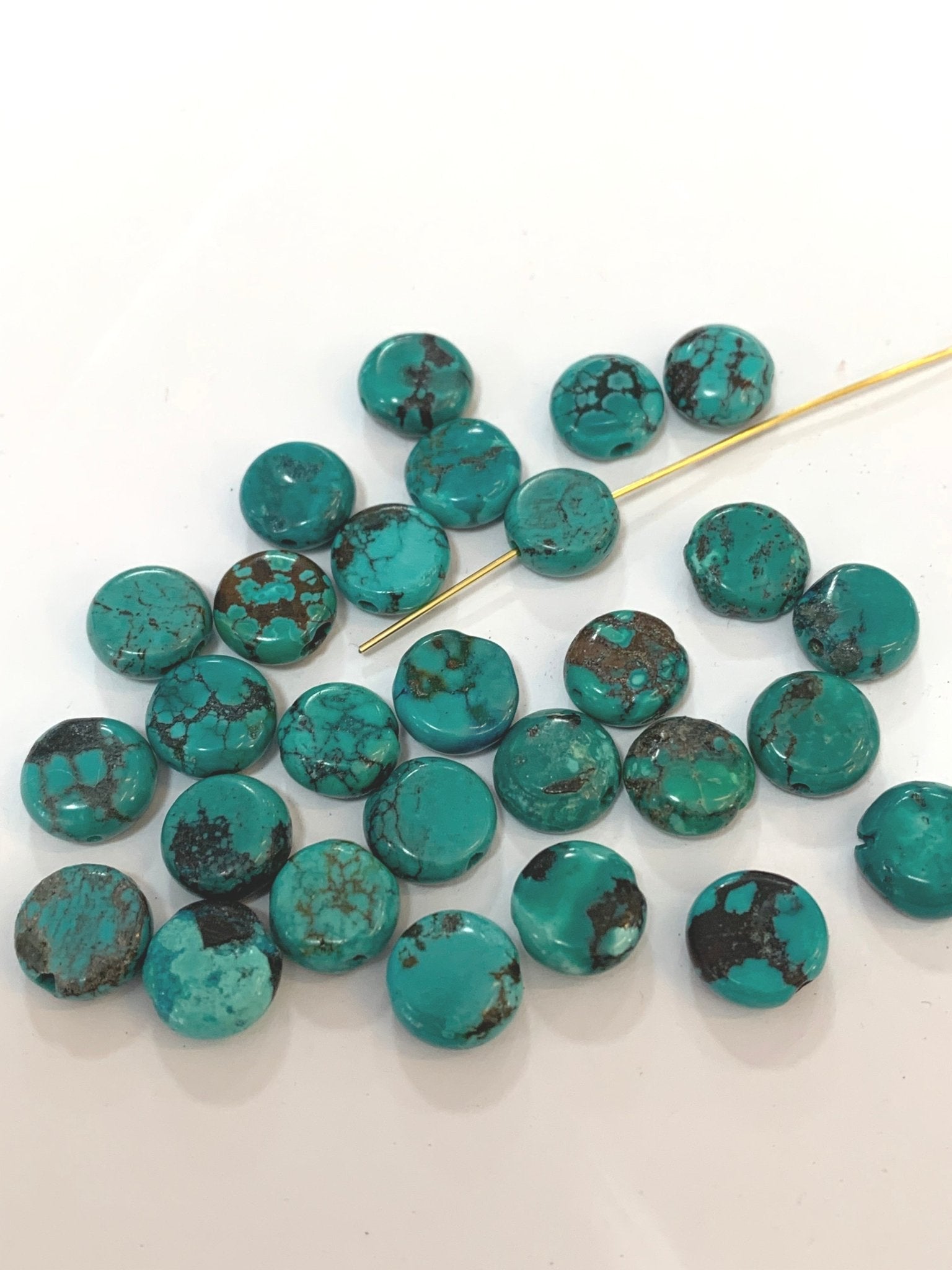 These turquoise coin shaped beads are 3/8” in diameter (10mm) and drilled horizontally (see headpin in picture).