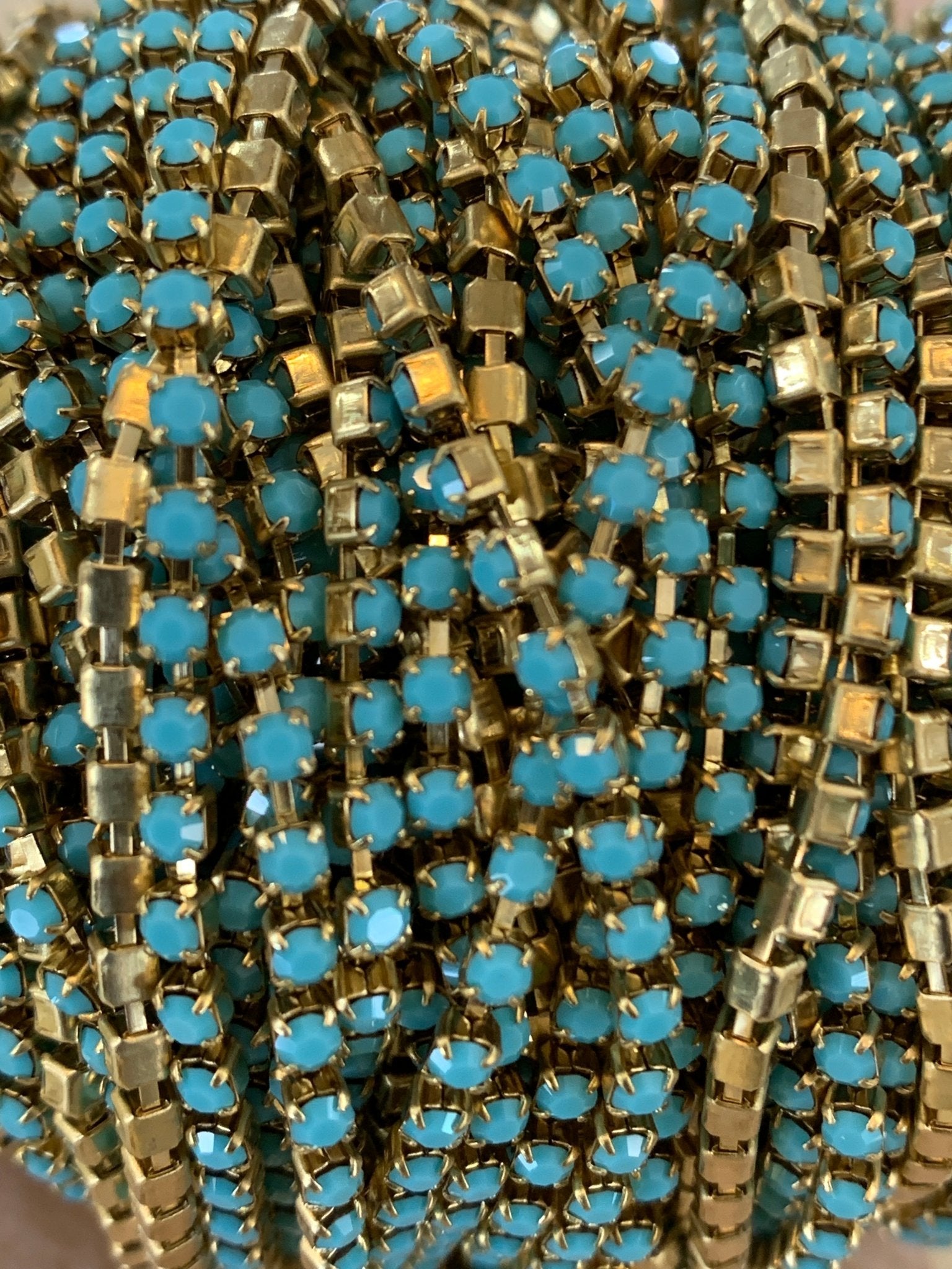 This metal banding has turquoise colored crystals set in brass banding. It is size 6.5 ss (2.1 mm crystal width).