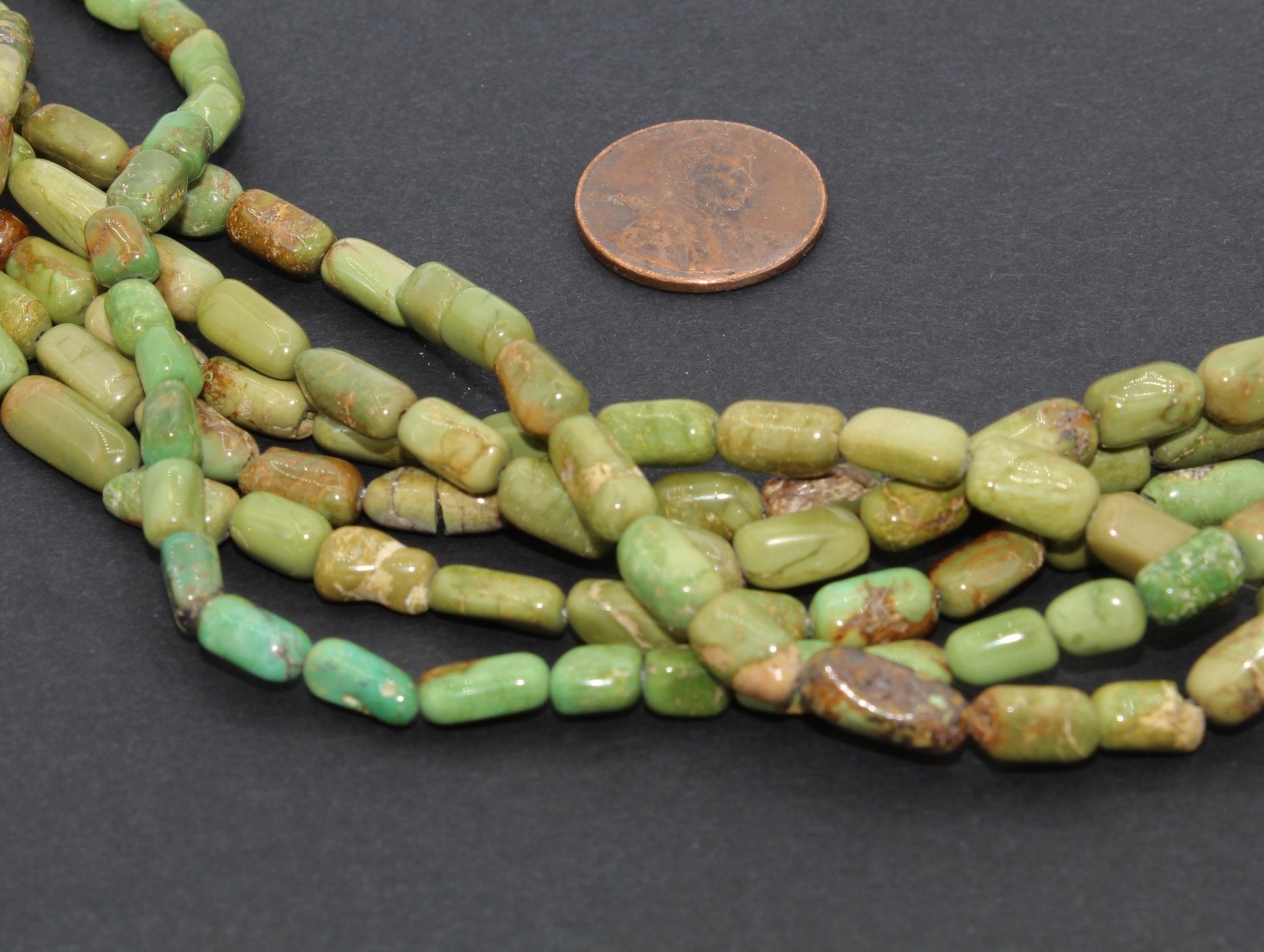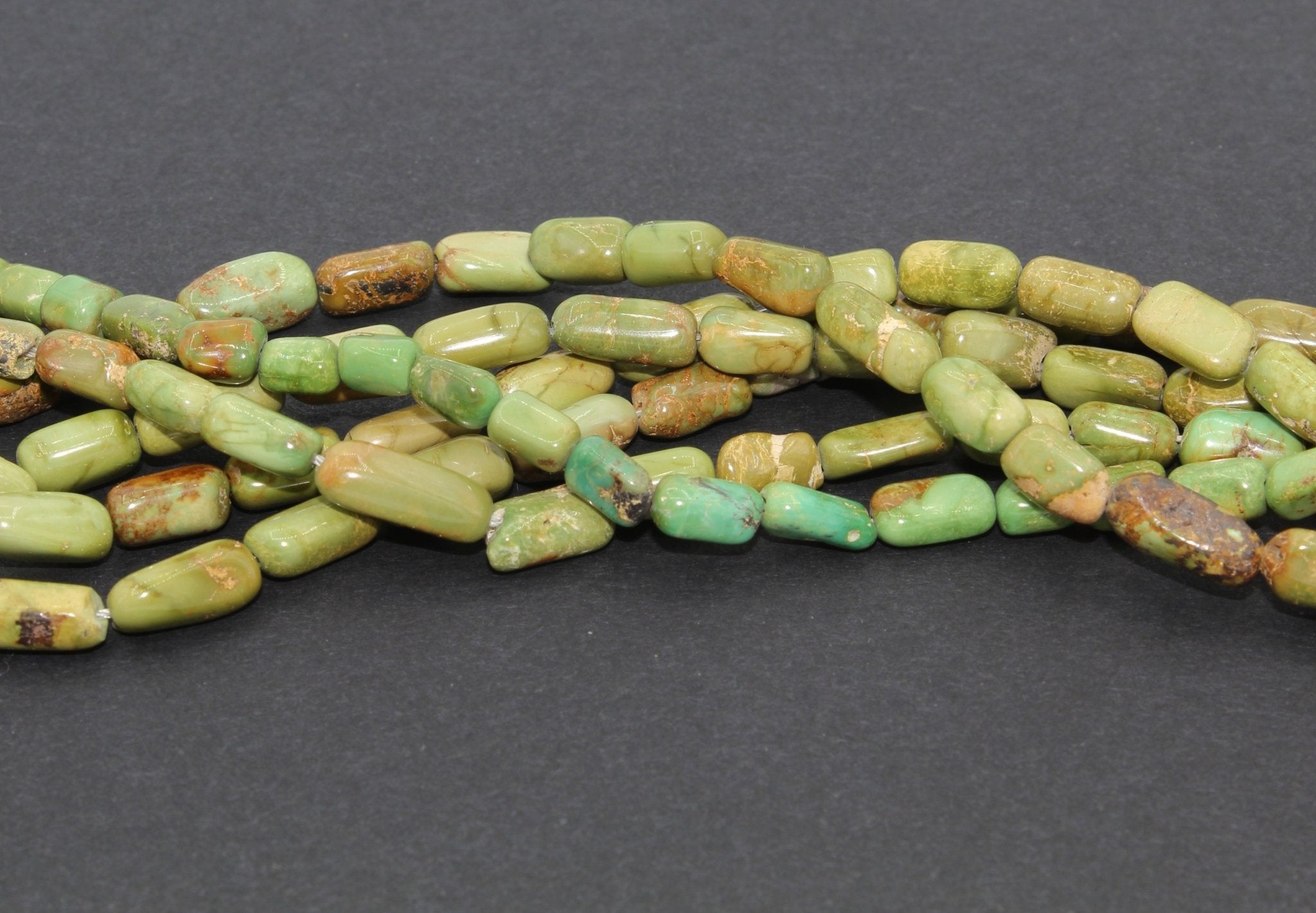 These Turquoise beads are shaped like irregular tubes with the hole running horizontally through the bead. They are primarily a green color with rust tones.