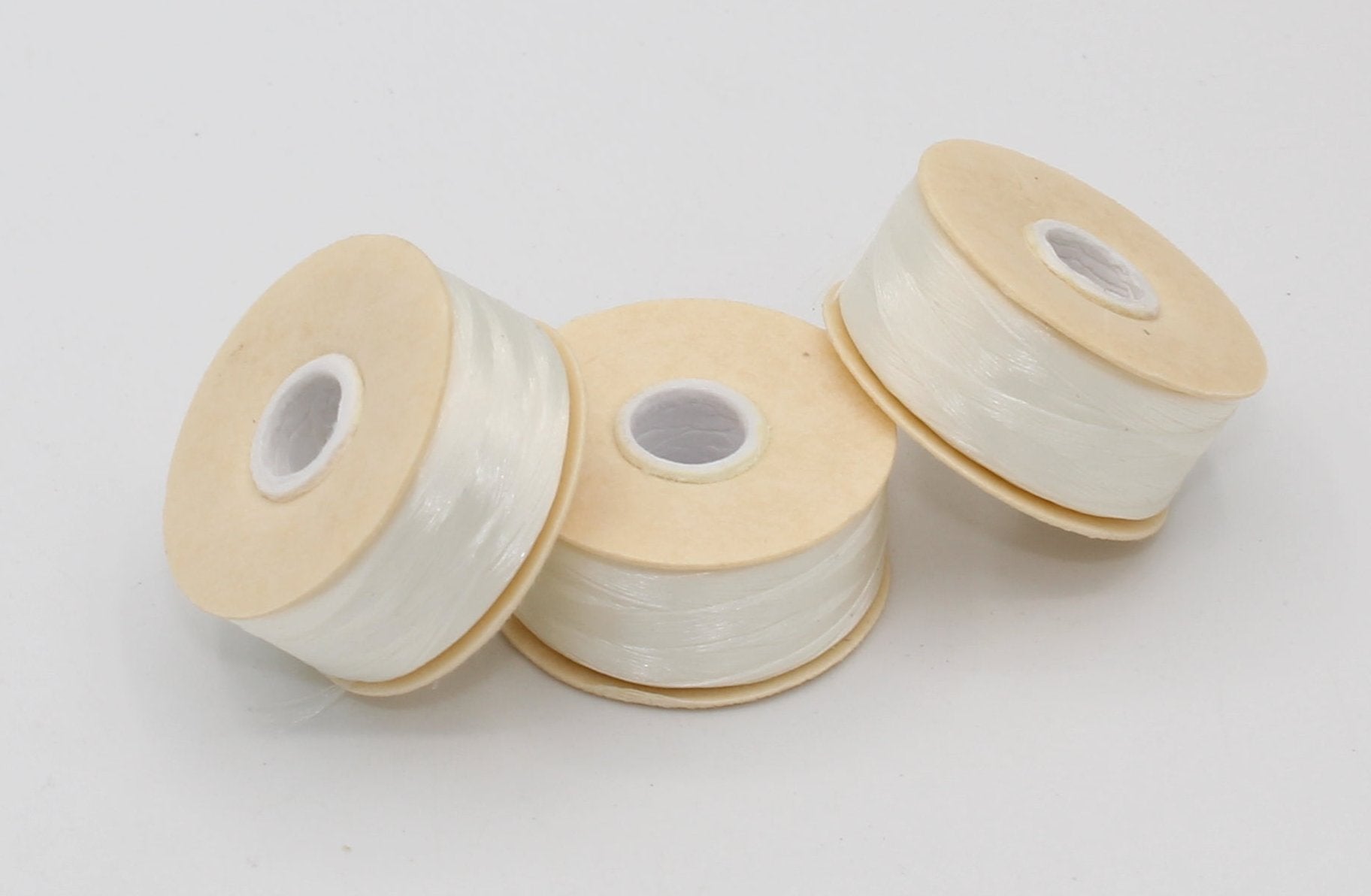 This Nymo thread is sold as an individual bobbin. It is white and works well with transparent and light colors. Nymo has a bit of stretch to it, making it a good choice for fringe.