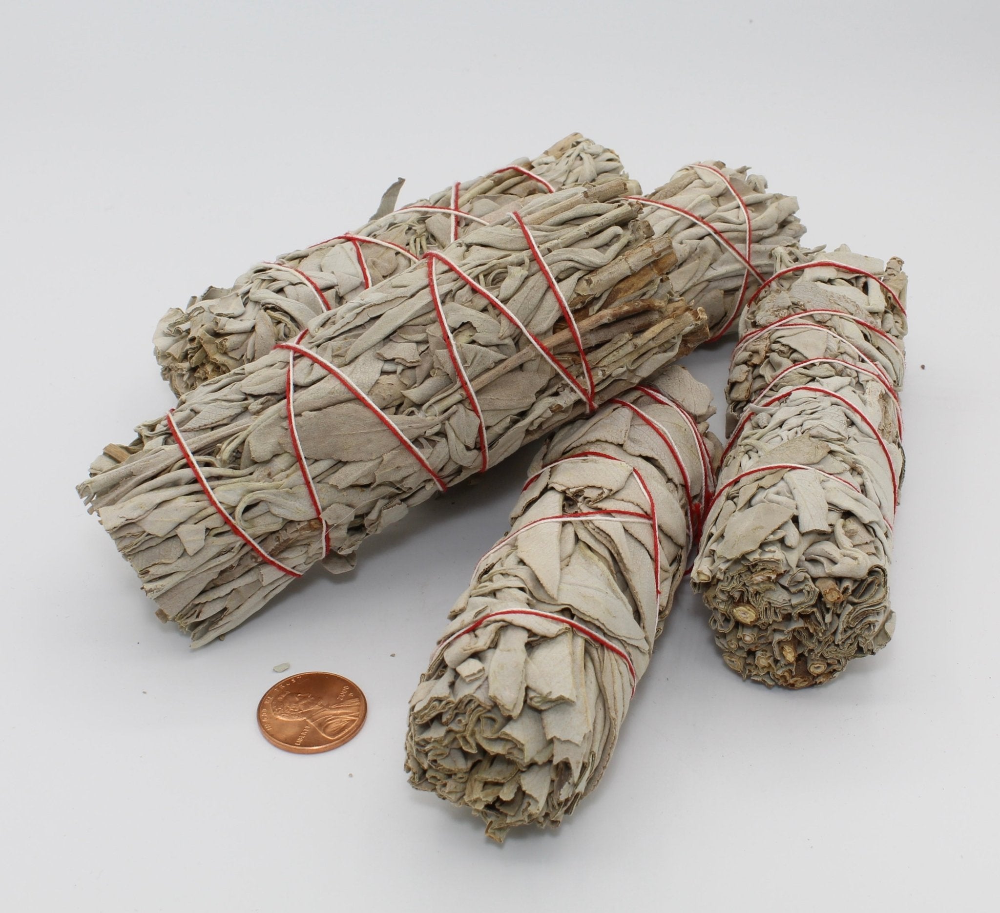 These bundles of white sage are 5" x 1 1/2". White sage is grown in California. It is often used to smudge a space, clearing it of negative energy.